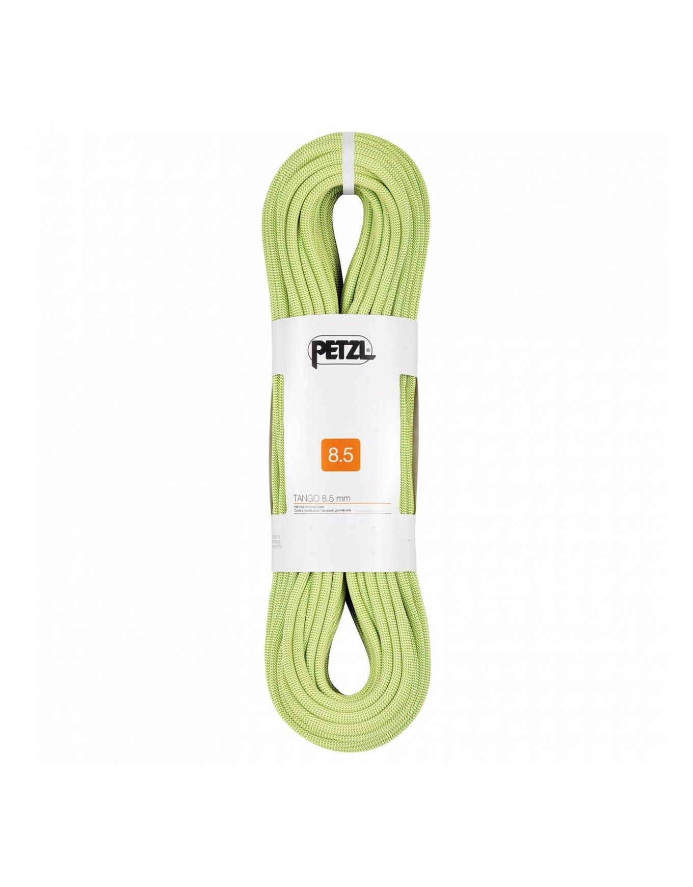 Corde à double Petzl Tango 8,5 mm jaune conçue pour l’escalade en grande voie, offrant souplesse et durabilité pour un usage fluide des appareils d’assurage.