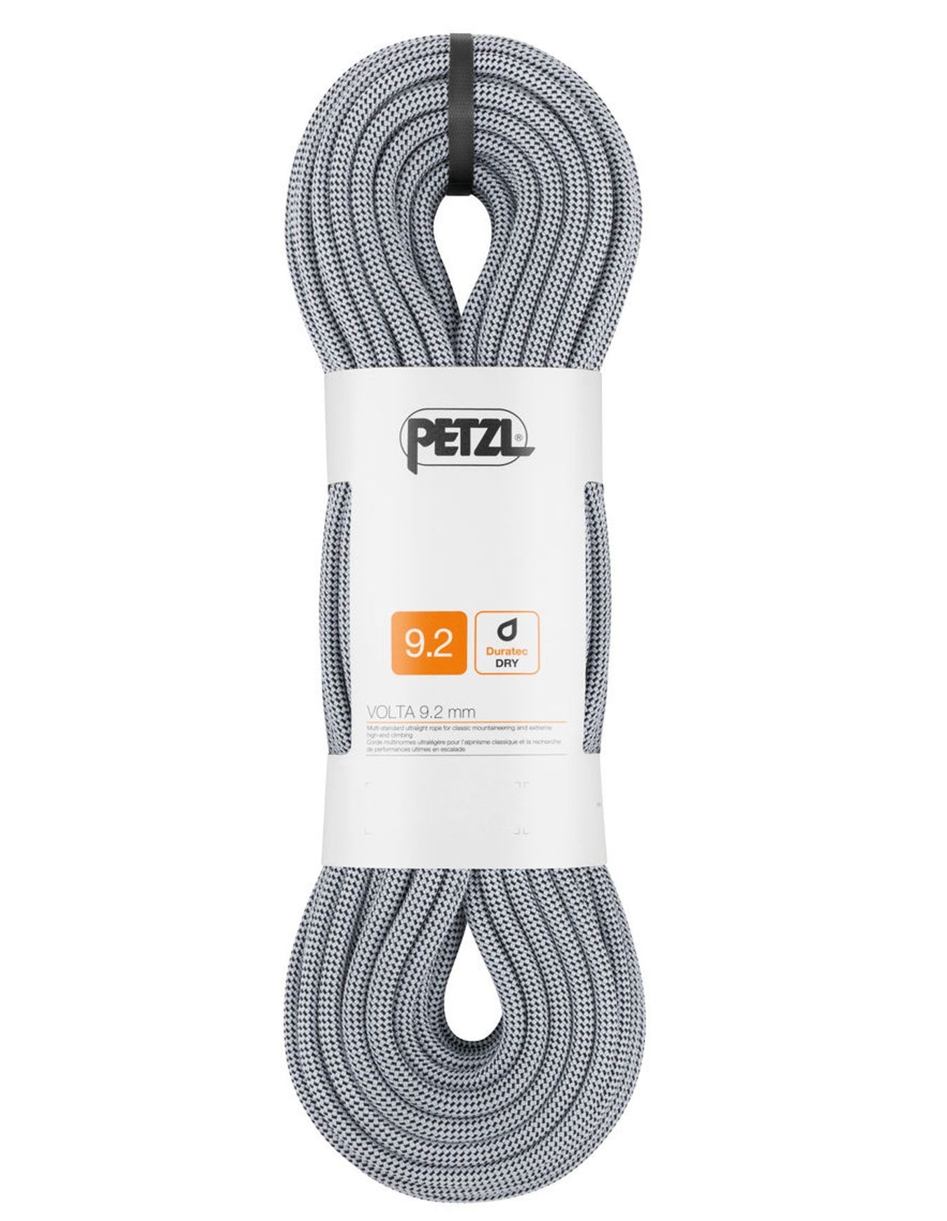Corde d’alpinisme Petzl Volta 9,2 mm, traitement Duratec Dry pour résistance à l’humidité et à l’abrasion, finition UltraSonic et marquage central pour plus de durabilité et de maniabilité.