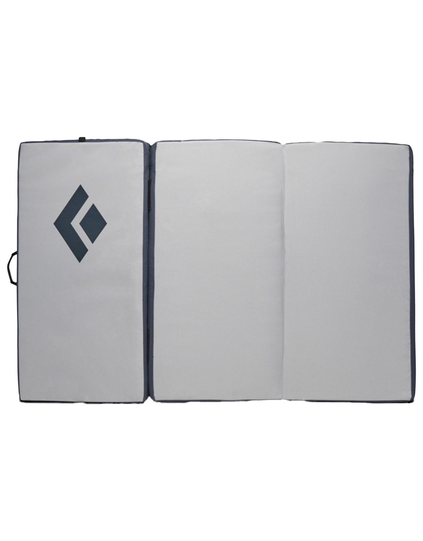 Crashpad Black Diamond Circuit Z Pewter : mousse bi-densité polyéthylène/polyuréthane pour absorber les chutes en bloc, pliage en trois et bretelles/cinture/poignées pour le transport, coins carrés compatibles multi-tapis.