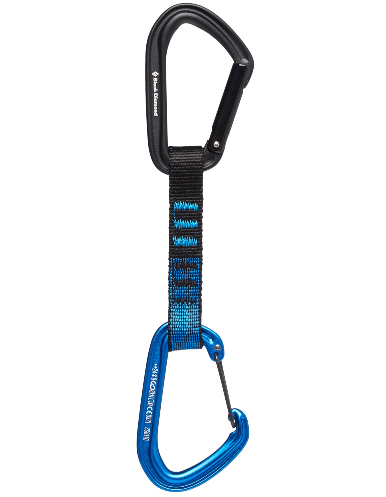 Le dessus est pourvu d’un mousqueton HotForge à doigt rigide, tandis que le bas accueille un mousqueton HotWire à doigt fil optimisé. Le système Keylock du mousqueton supérieur assure une insertion et une déconnexion fluides, sans accrochage. Le mousqueton inférieur, bicolore, offre un repère visuel immédiat sur la voie. L’ensemble est fixé à une sangle de 18 mm intégrant le système Straitjacket.