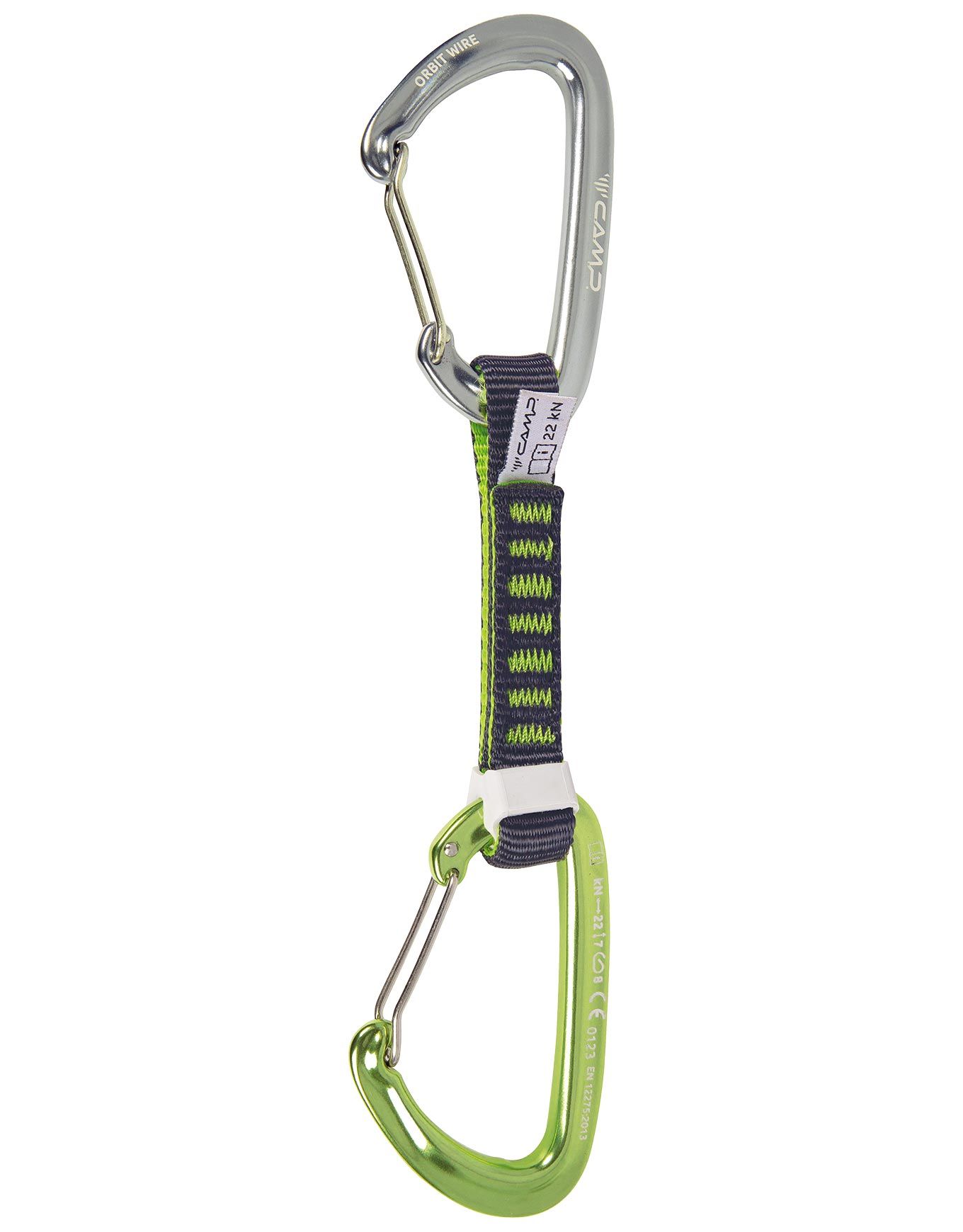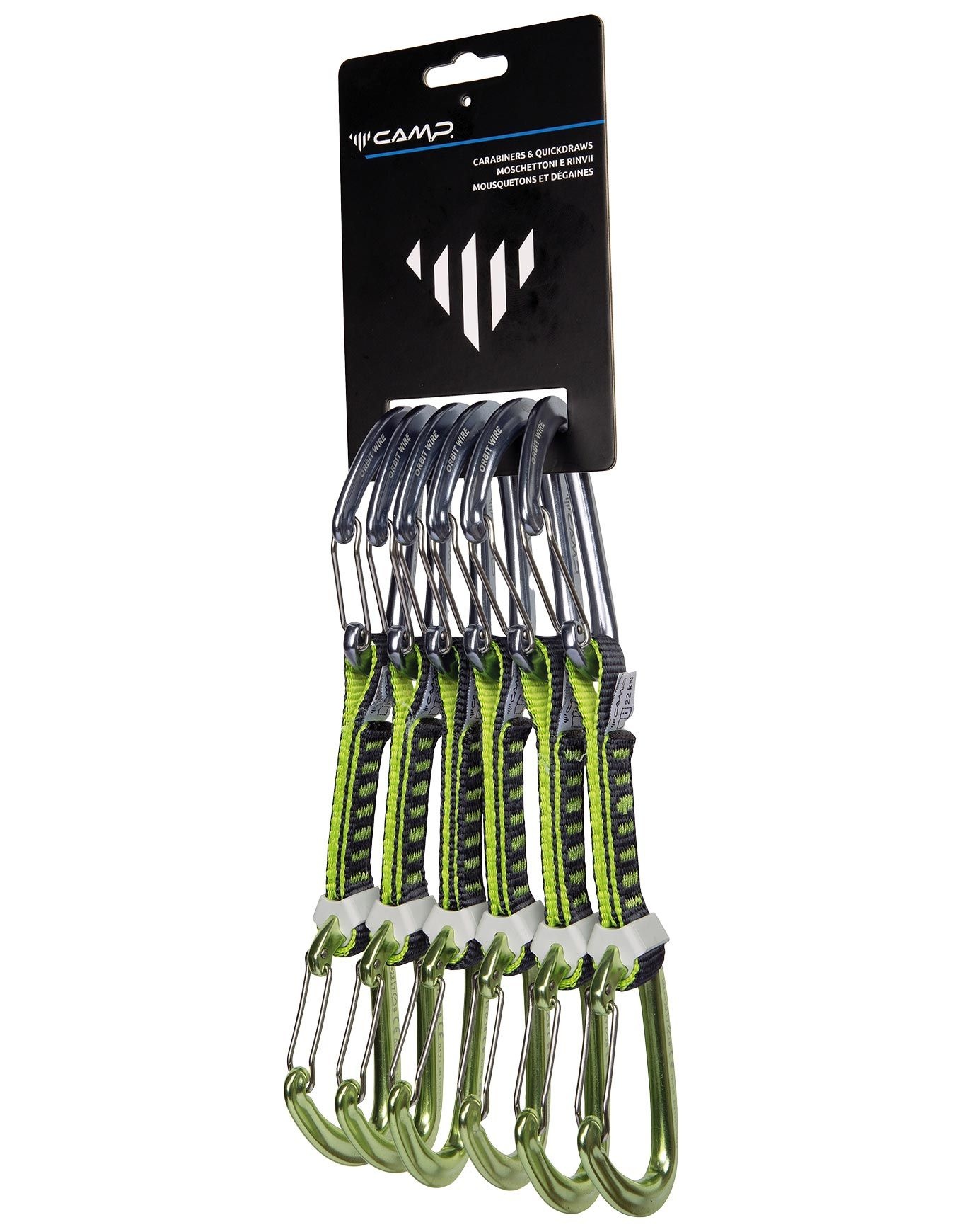 Pack 6 Orbit Wire Express 12 cm : dégaines Camp pour l’escalade traditionnelle avec mousquetons fil Orbit Wire, sangle nylon 16 mm 22 kN et système SphereLock pour sécurité accrue.