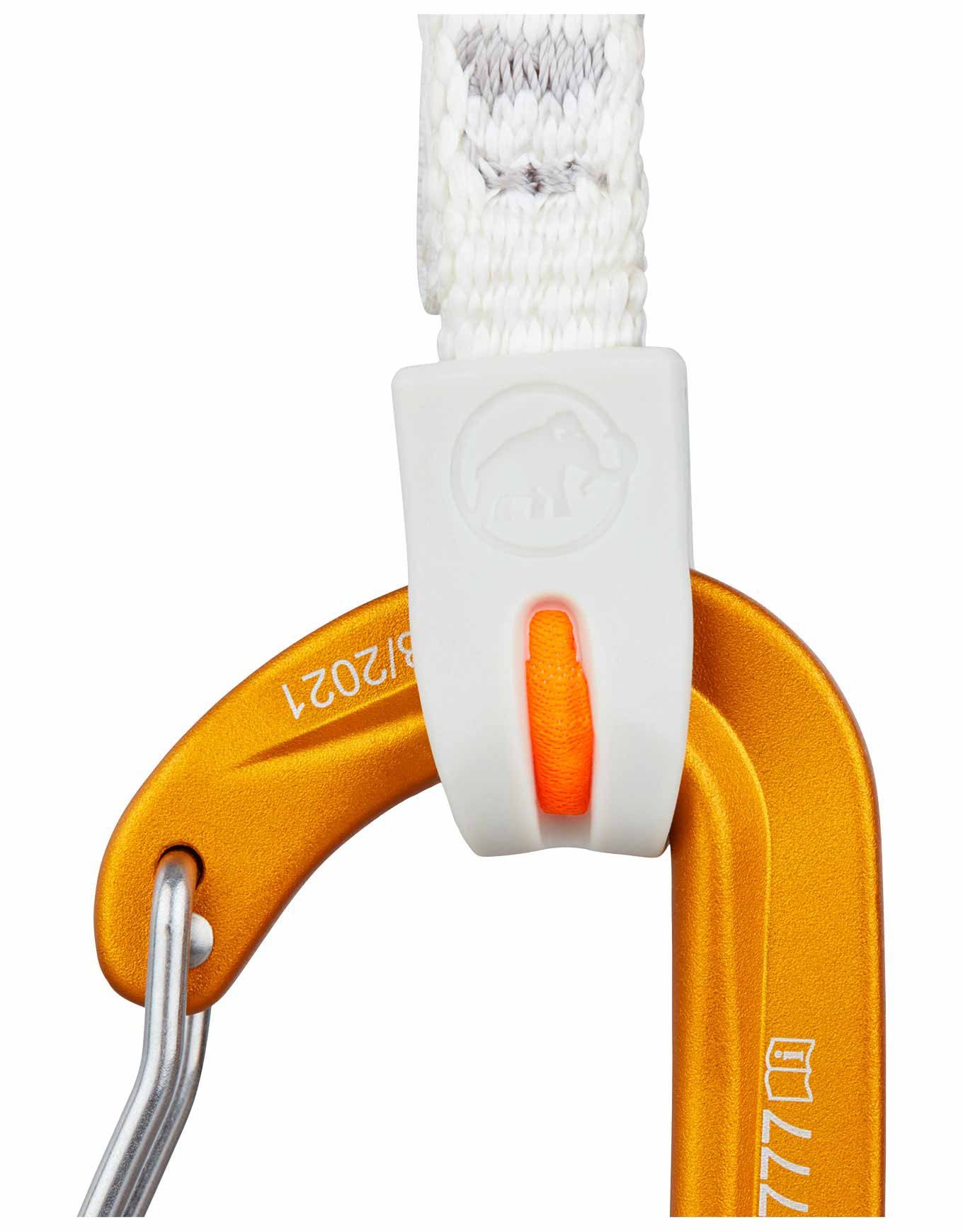 Dispositif de sécurité maintenant le mousqueton inférieur en position et limitant l’usure de la sangle.