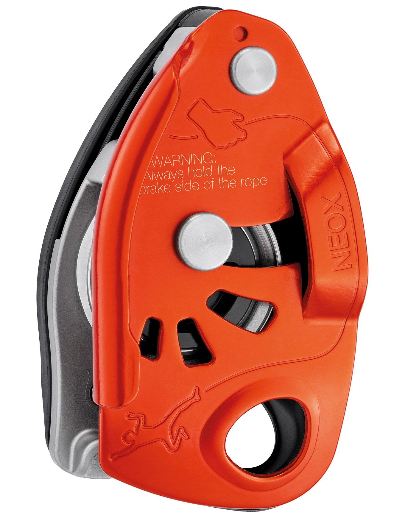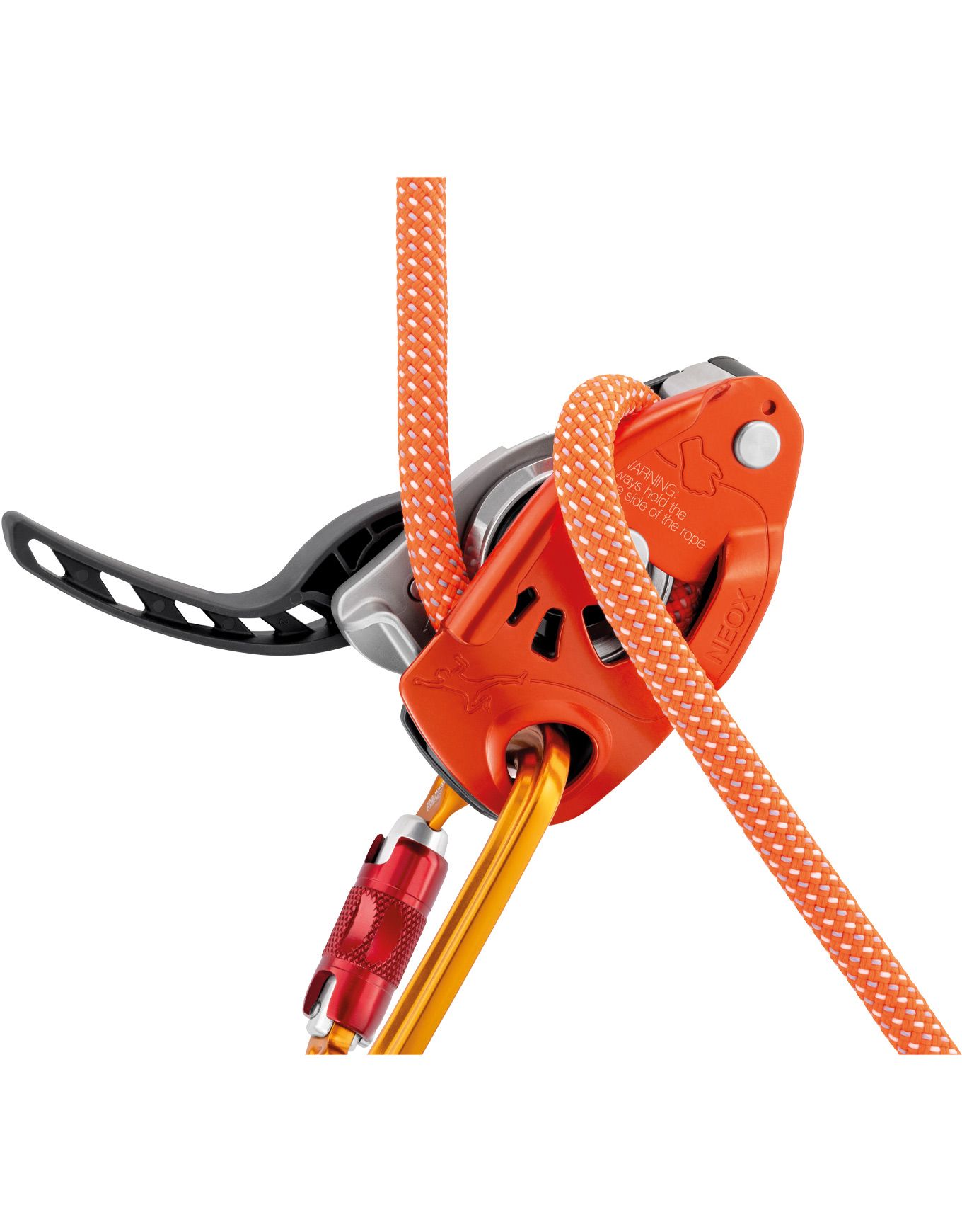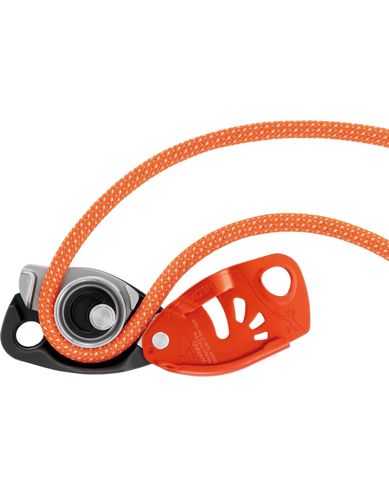 Assureur d’escalade Petzl Neox Orange avec blocage assisté, idéal salle et falaise. Roue intégrée pour une descente fluide des cordes 8,5-11 mm, poignée ergonomique.