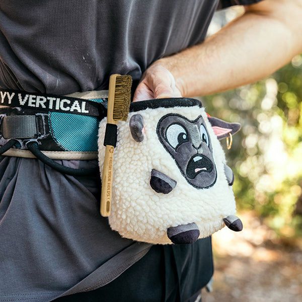Sac à magnésie YY Vertical en forme de mouton, doté d’une large entrée, d’un porte-brosse, d’un cordon de serrage et d’une sangle ventrale réglable pour un confort pratique à la falaise.