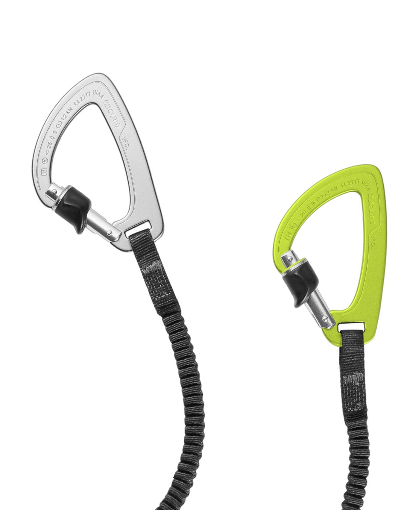 Les brins élastiques en HPMEL’utilisation de sangles fines et ultralégères, dotées d’une résistance accrue à l’abrasion, combinée à des mousquetons ultralight, un absorbeur d’énergie et une suspension raccourcie, procure une manipulation aisée et confortable. Ce dispositif offre une absorption optimale des chocs quel que soit le poids de l’utilisateur (de 40 à 120 kg).