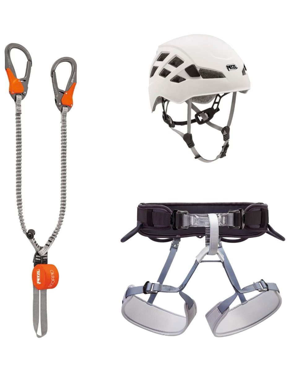 Pour débuter la via ferrata, Petzl propose avec son Kit Via Ferrata Eashook un ensemble complet rassemblant l’équipement indispensable. On y trouve un casque Boreo en taille M/L, un baudrier Corax ajustable et une paire de longes Scorpio Eashook.