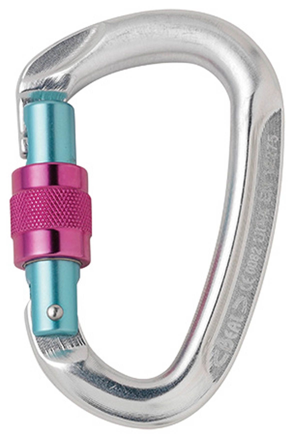 Mousqueton de sécurité à vis : verrouillage par rotation d’une bague entre le corps et le doigt. Déverrouillage en tournant dans le sens inverse.