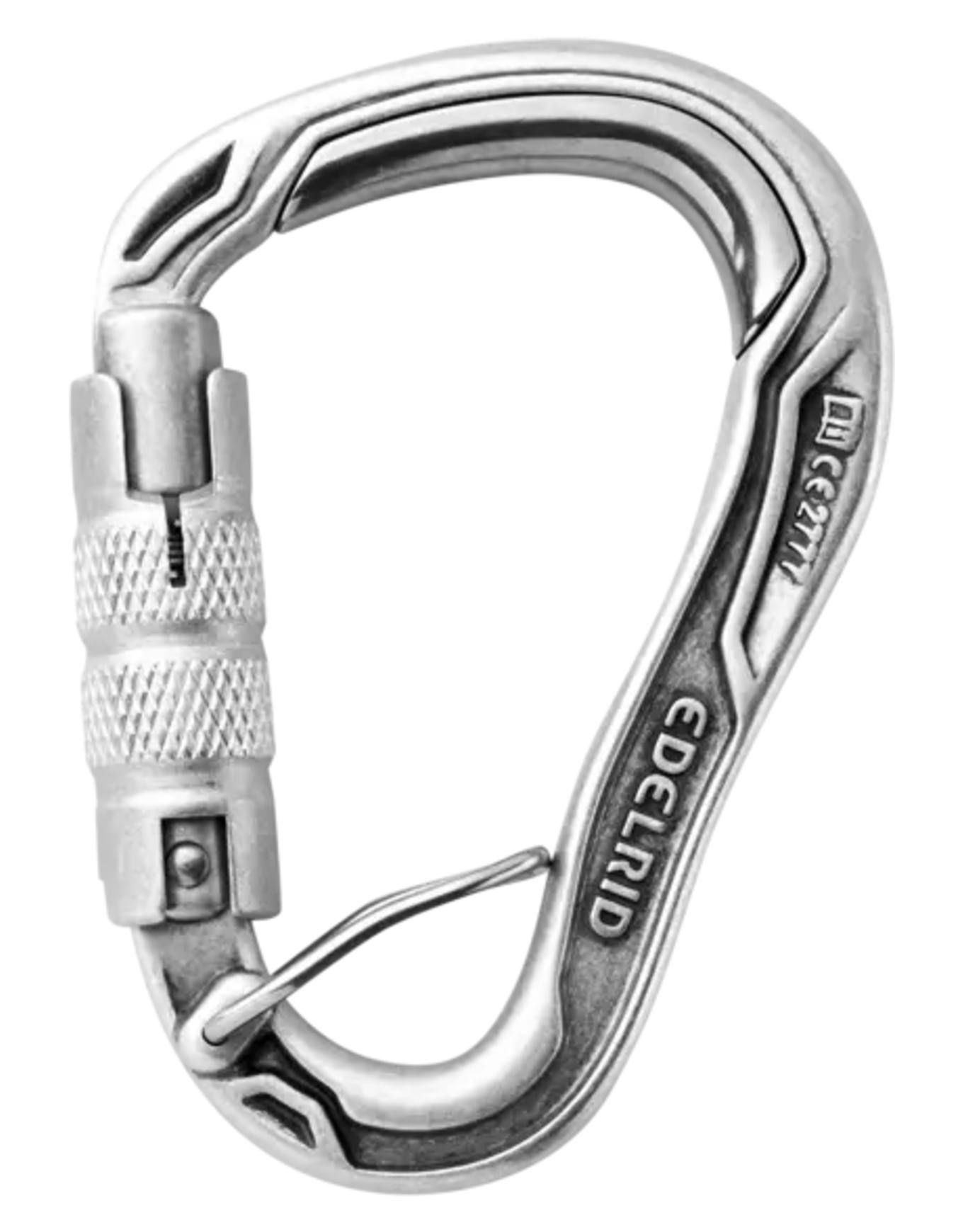 Le mousqueton Edelrid HMS Bulletproof Triple FG Eco, conçu pour l’assurage en escalade, combine fermeture Keylock fluide, barre à ressort anti-rotation et insert acier anti-usure dans une construction #ClimbGreen.