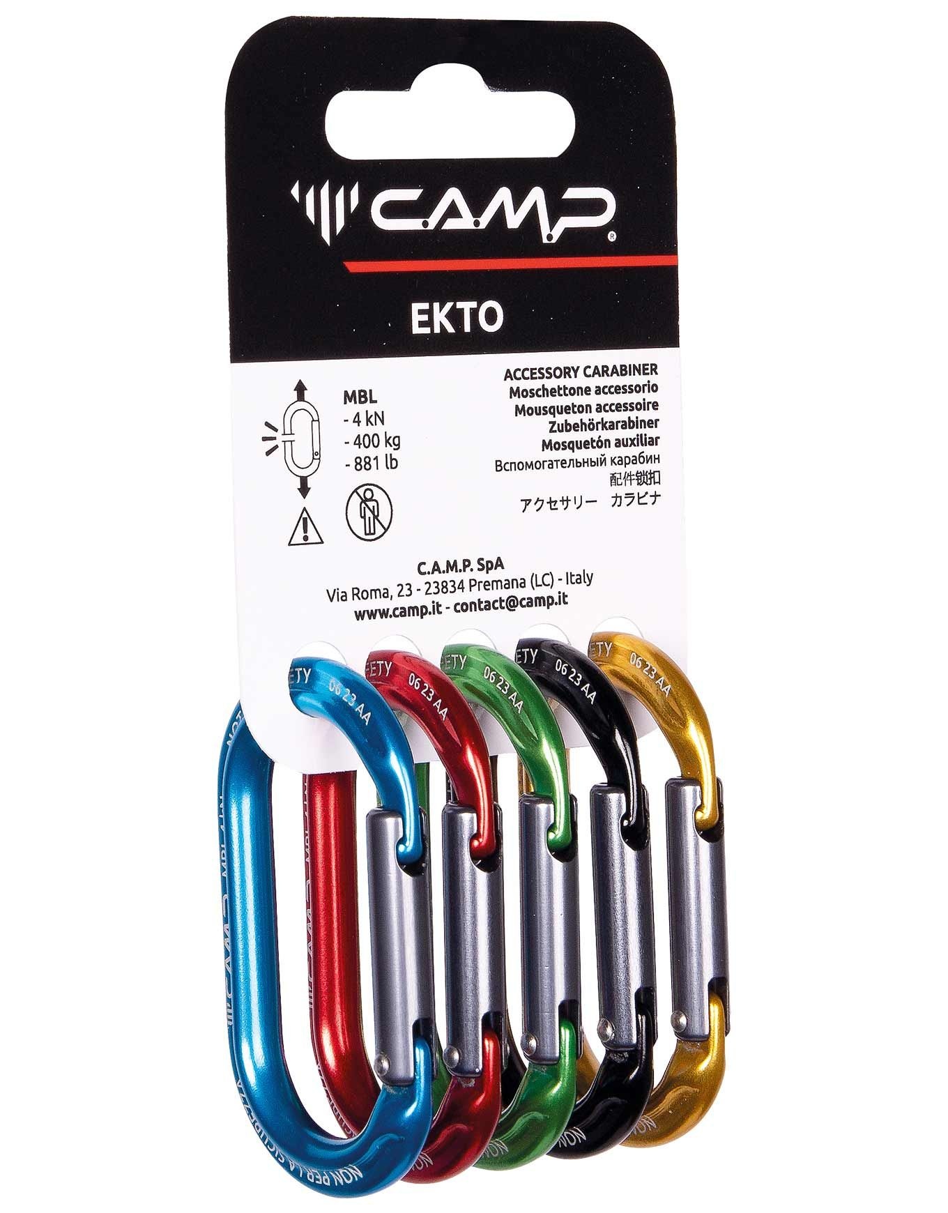 Camp Rack Pack Ekto : lot de 5 mousquetons en alliage 7075, 4 kN, ultra-légers, doigt plein, fermeture automatique, anti-enchevêtrement pour usages non sécuritaires.