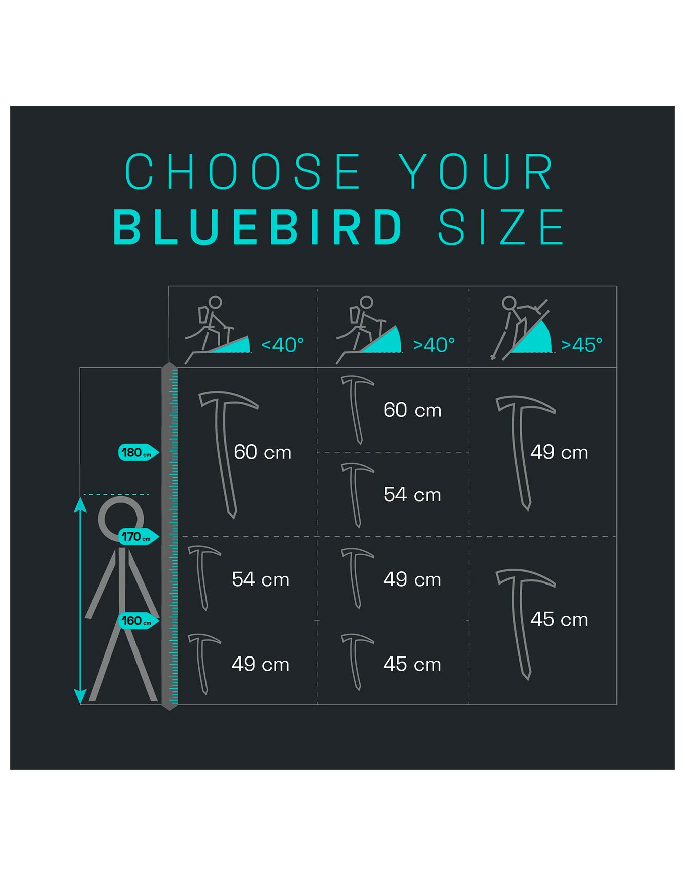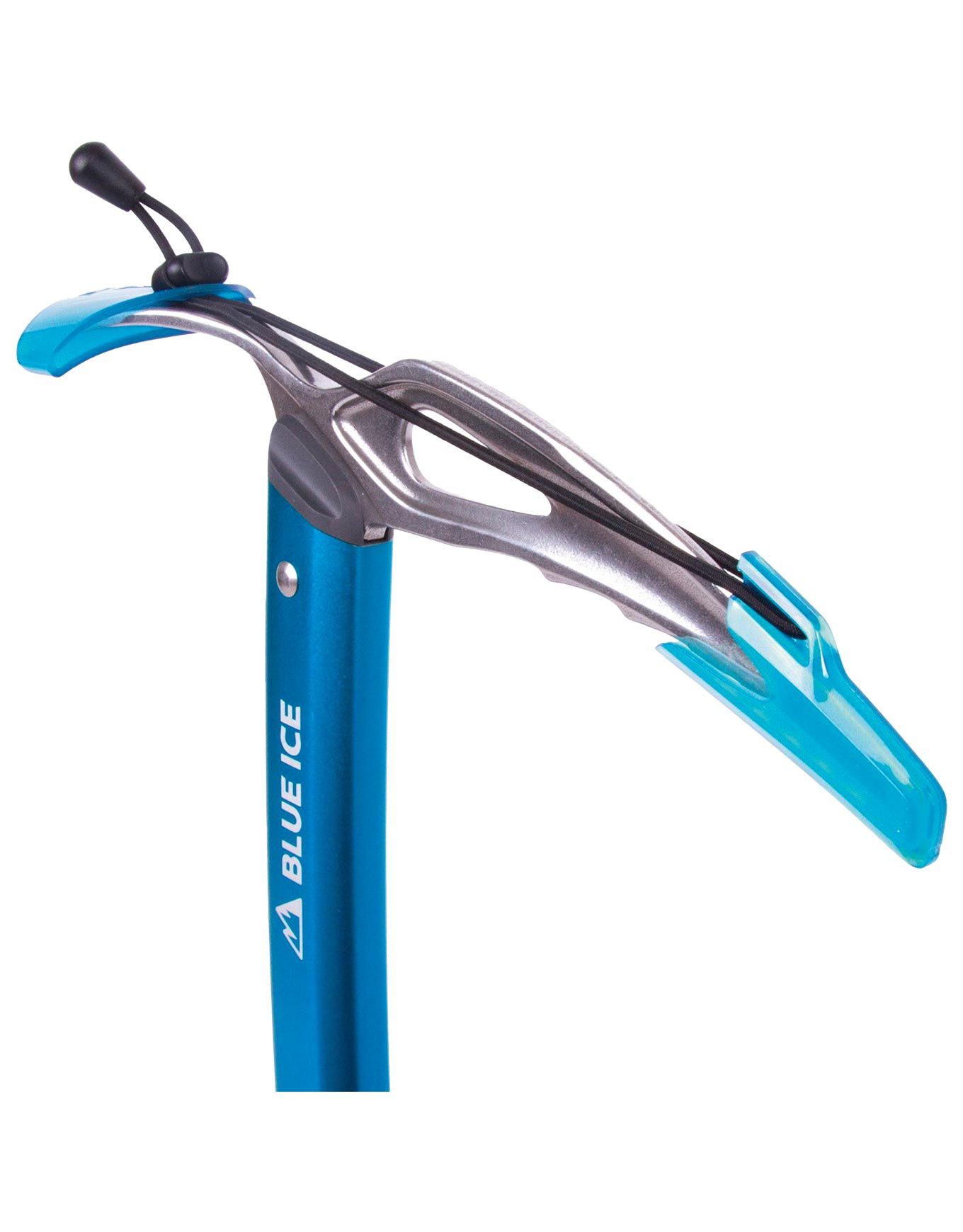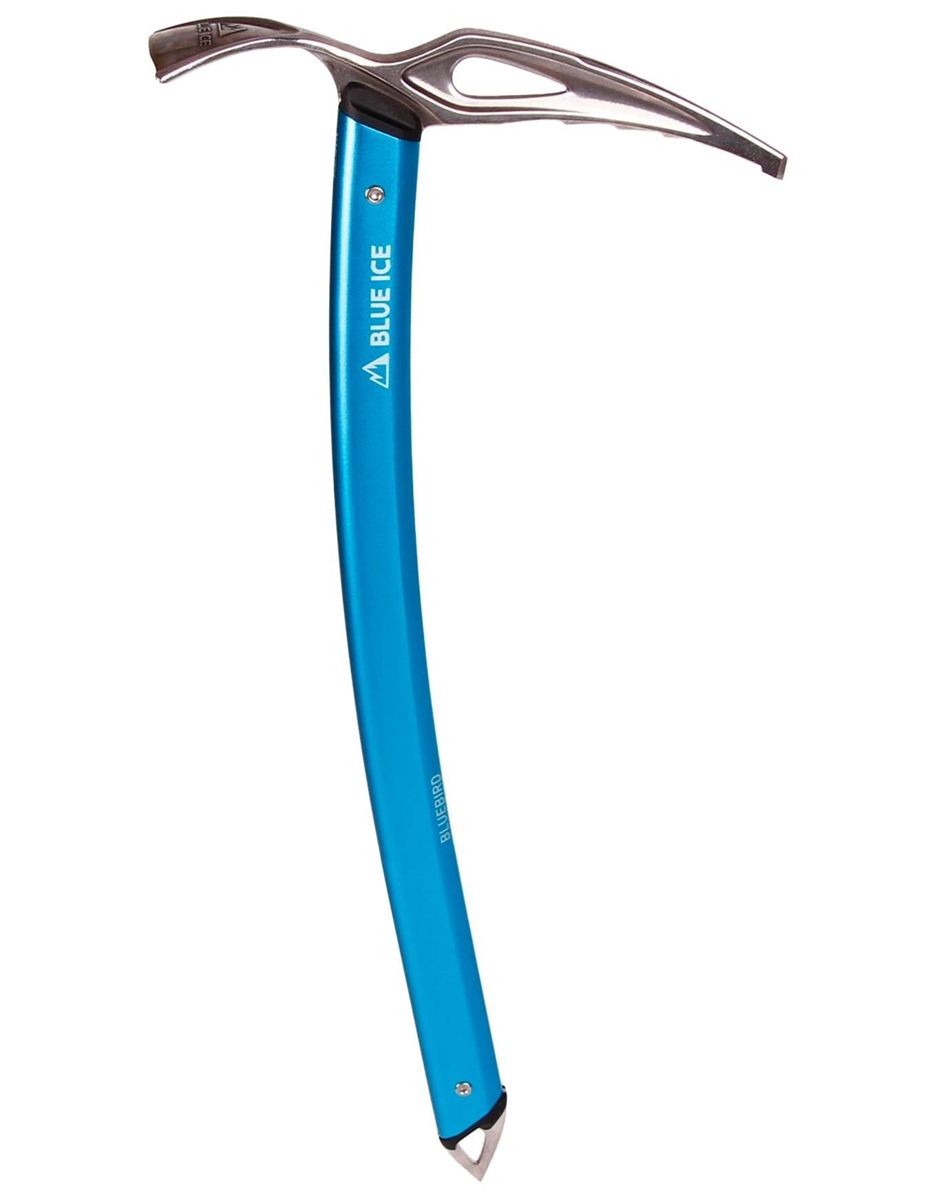 Bluebird de Blue Ice, piolet ultrarésistant pour pentes raides neige-glace, combine manche aluminium sablé, tête et pointe acier inoxydable forgées à chaud, traitement anticorrosion, légèreté et polyvalence extrême.