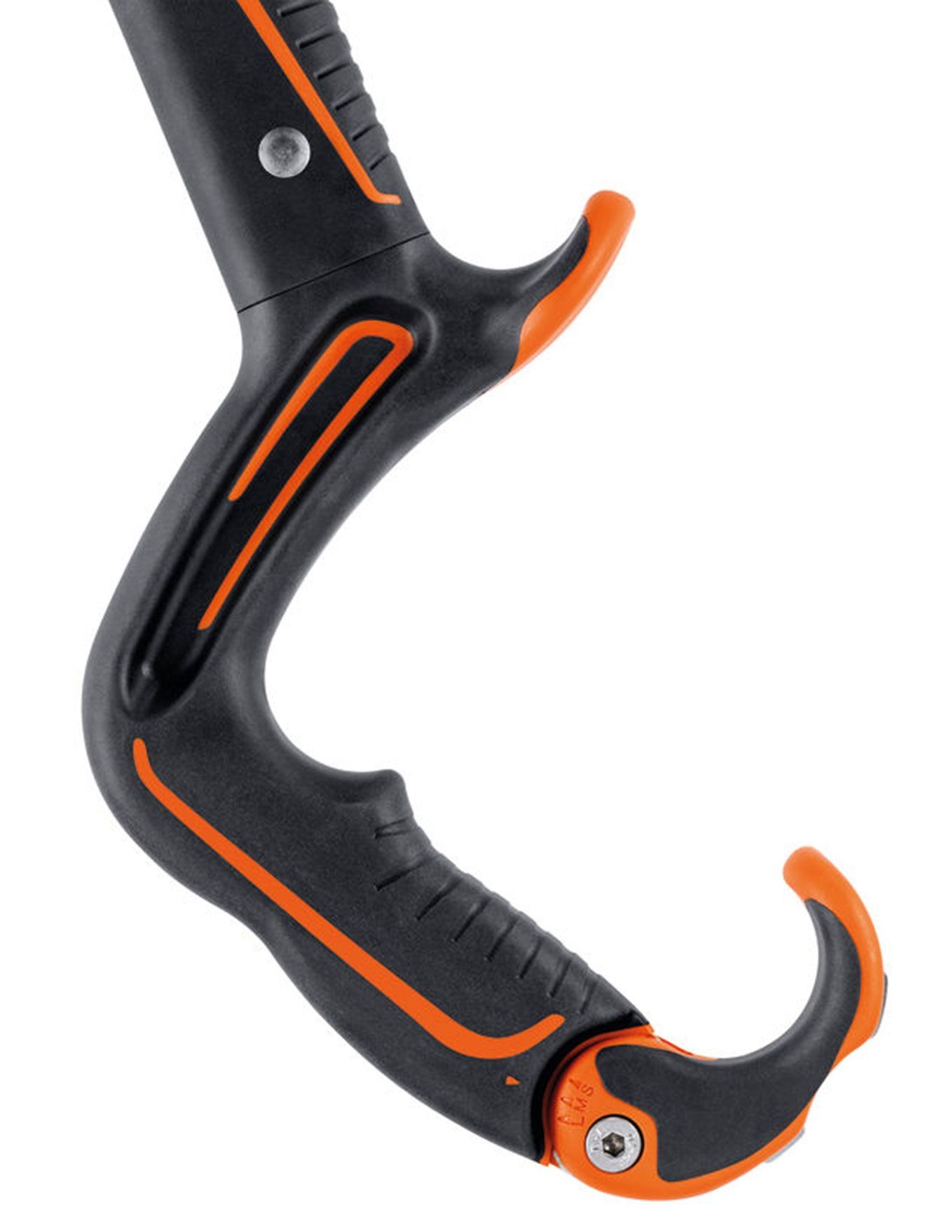 Optimale que ce soit sur rocher ou sur glace, la lame DRY permet en outre de bien la coincer dans les fissures étroites avec les masselottes. Un marteau minimaliste mais solide se retrouve à l’opposé pour agir sur les pitons. Une modularité complète est également offerte par le piolet.