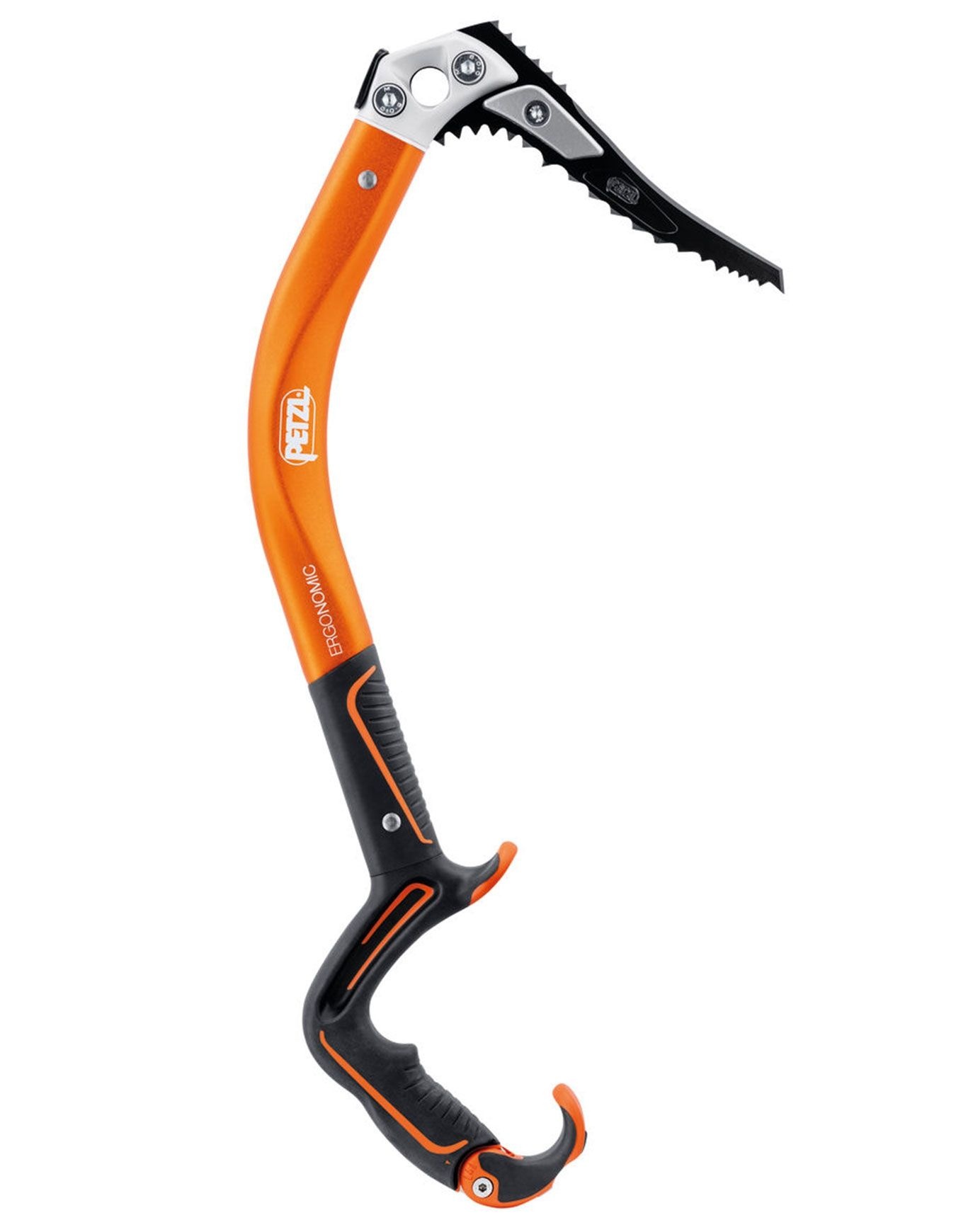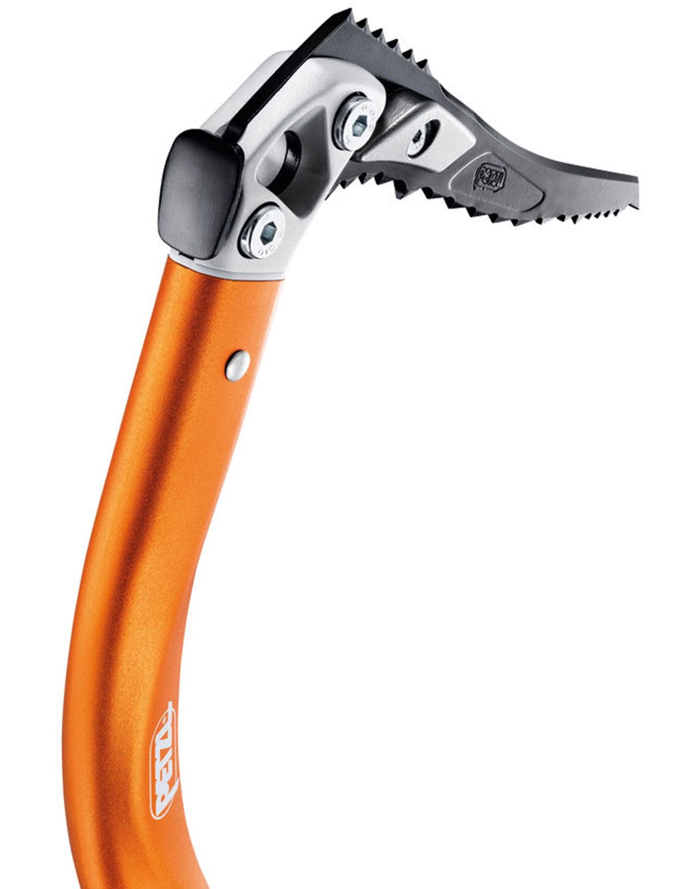 Piolet Petzl Ergonomic pour dry tooling et cascade de glace technique : manche ultra-courbé, double poignée réglable, lame DRY roche-glace, modularité complète.