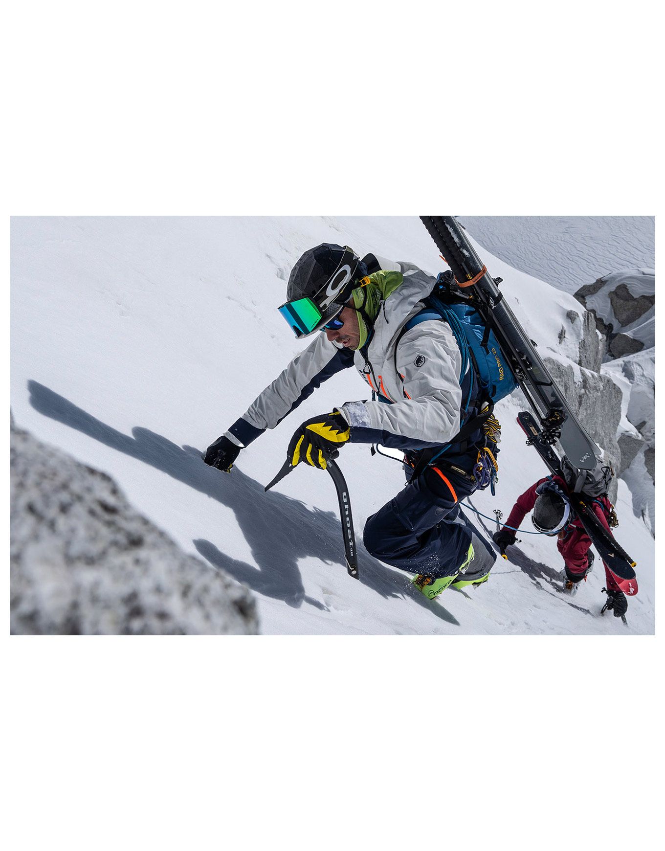 Le manche courbé fait office de canne lors des randonnées glaciaires tout en assurant une prise solide en escalade alpine, ce qui transforme l’outil en support technique pour frayer un passage entre les blocs de glace ou enfoncer des pitons à l’aide du marteau incorporé. À l’extrémité du manche, un ergot de repos offre la possibilité de soulager temporairement le poignet durant l’ascension.