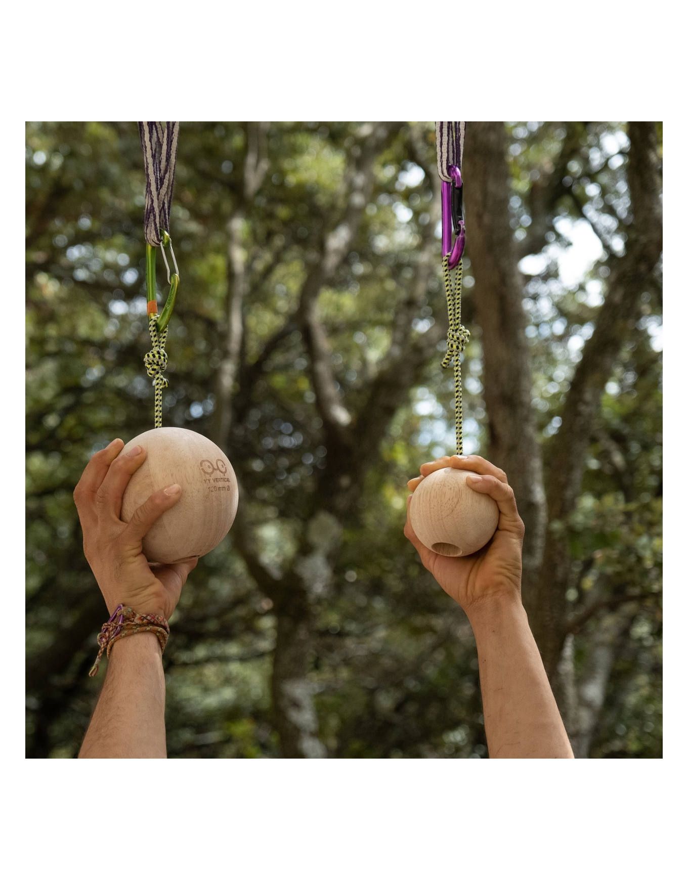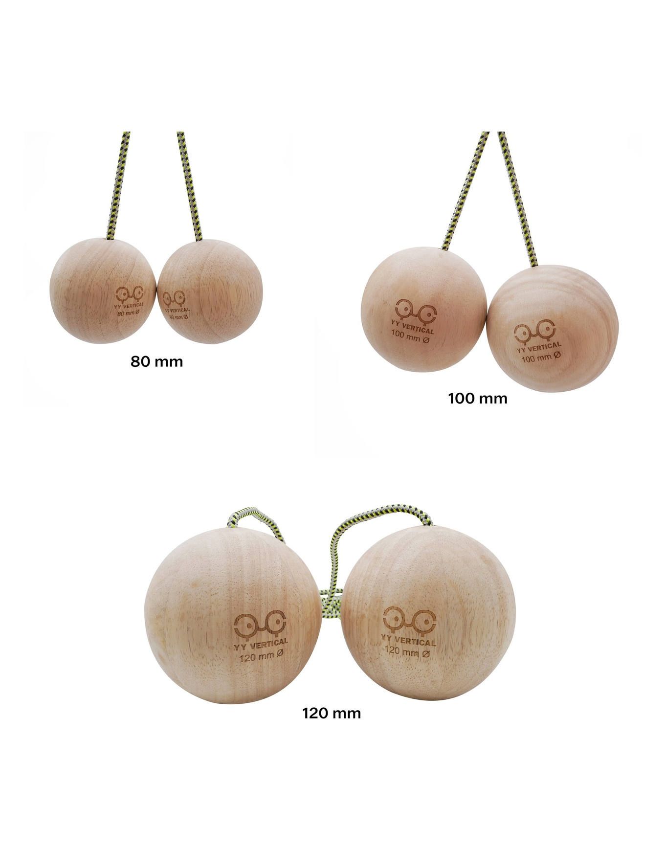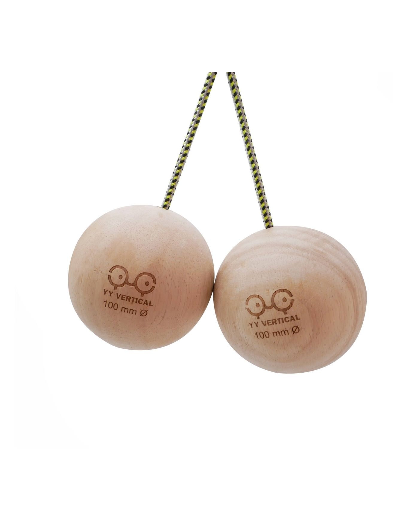 YY Vertical Climbing Balls 12 cm, agrès d’entraînement vendus par paire, développent force de préhension et résistance en escalade. Bois de caoutchoutier recyclé, toucher doux, adaptés débutants et confirmés.