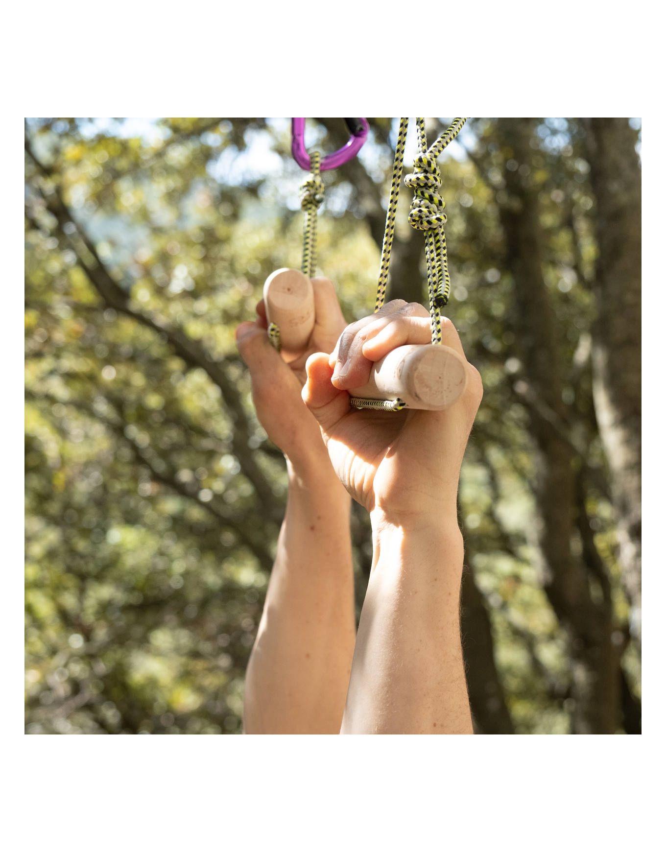 Les Cylinder Twins 55 mm d’YY Vertical sont des cylindres d’entraînement en bois de caoutchoutier recyclé, réglables à l’horizontal ou à la verticale pour travailler tractions et suspension du haut du corps.