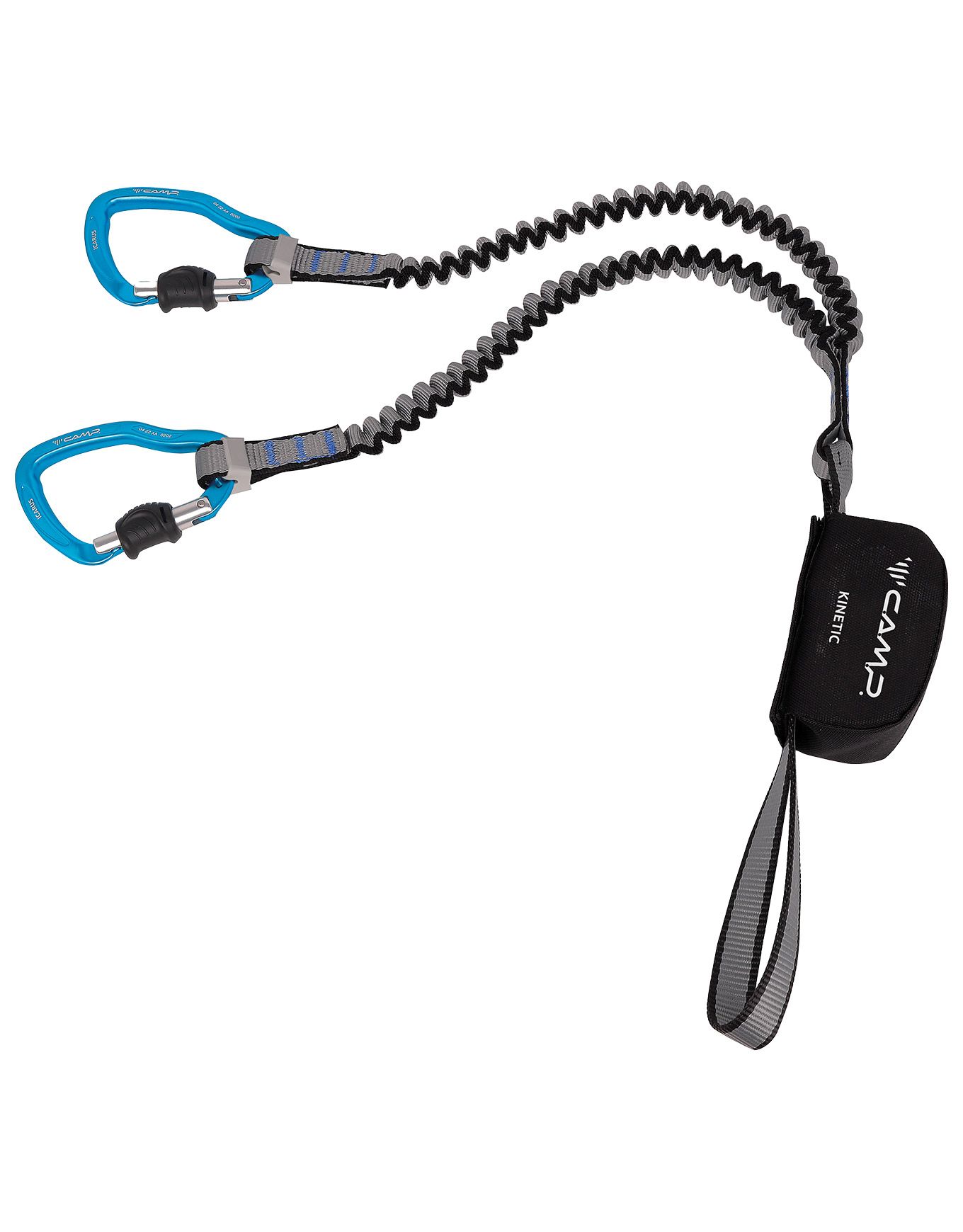 La longe de via ferrata Camp Kinetic Rewind Comp allonge 75-110 cm en polyester élastique 19 mm, absorbe les chocs par déchirement et se fixe par mousquetons Icarus aluminium 24 mm, 435 g, normes EN 958:2017/EN 12275, 40-120 kg.