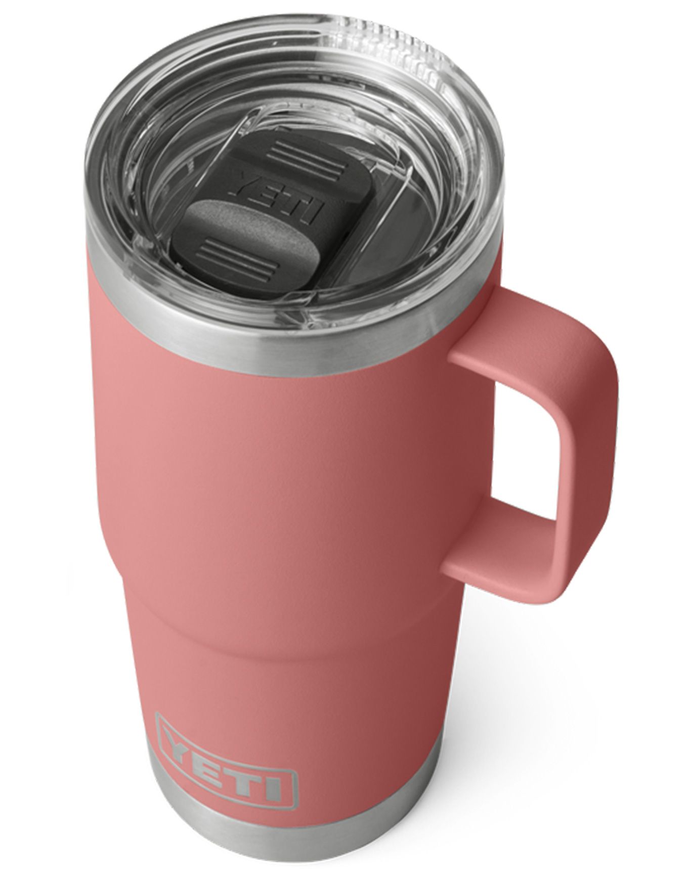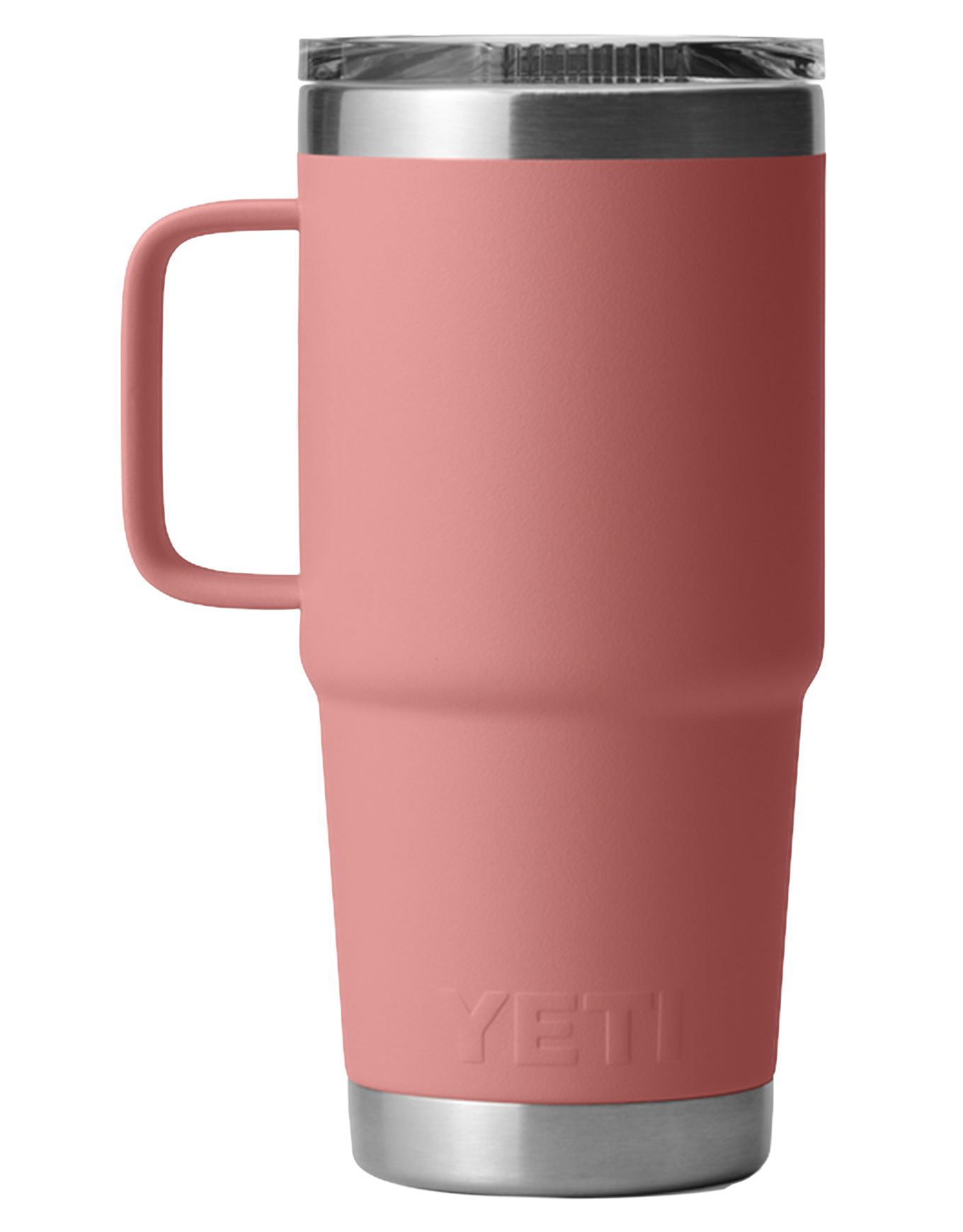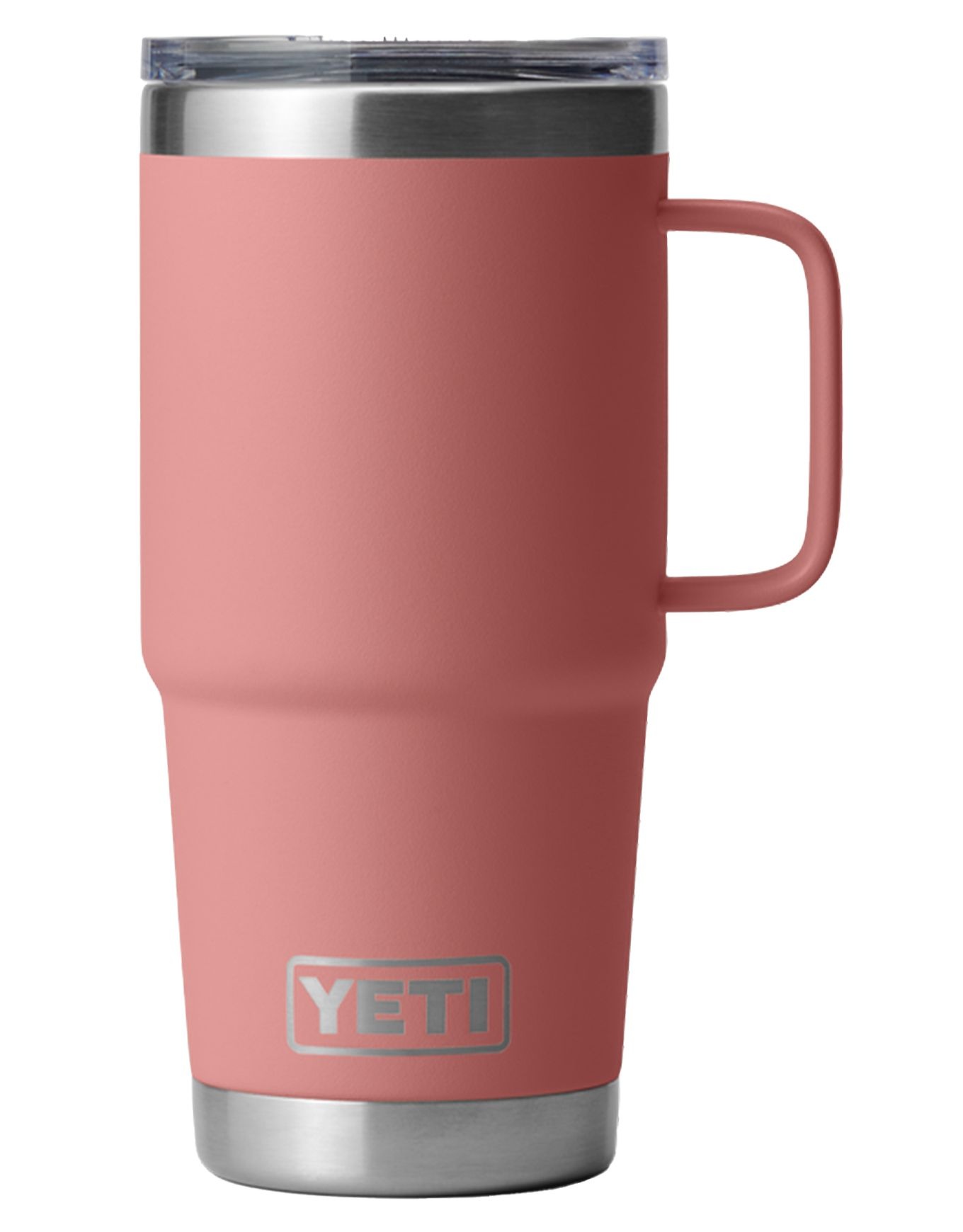 Yeti Rambler 20 Oz Travel Mug 2.0 Sandstone Pink est une tasse de voyage isotherme en acier inoxydable avec couvercle étanche Stronghold™ à double glissière magnétique, isolation sous vide prolongée, poignée surélevée et compatibilité lave-vaisselle.