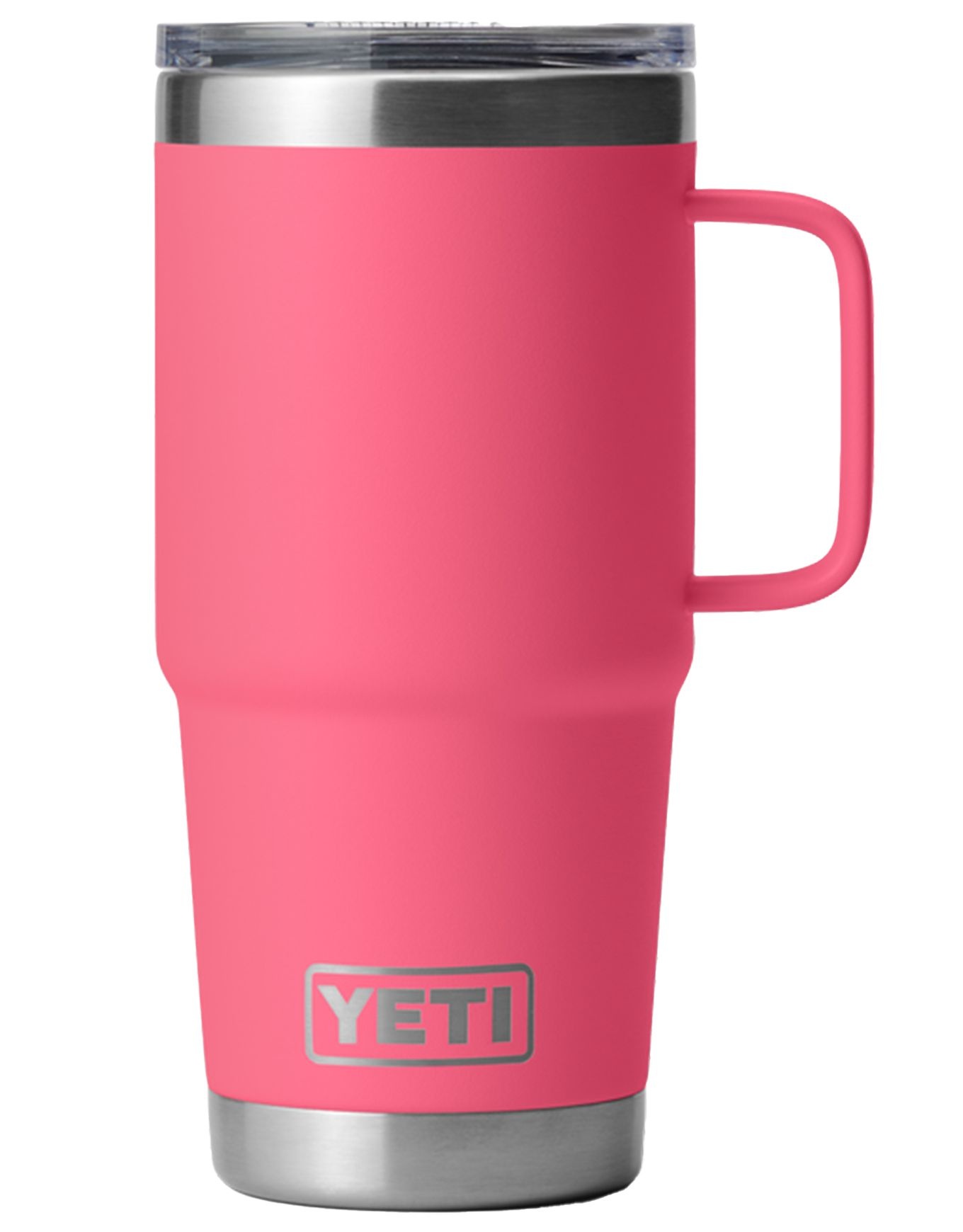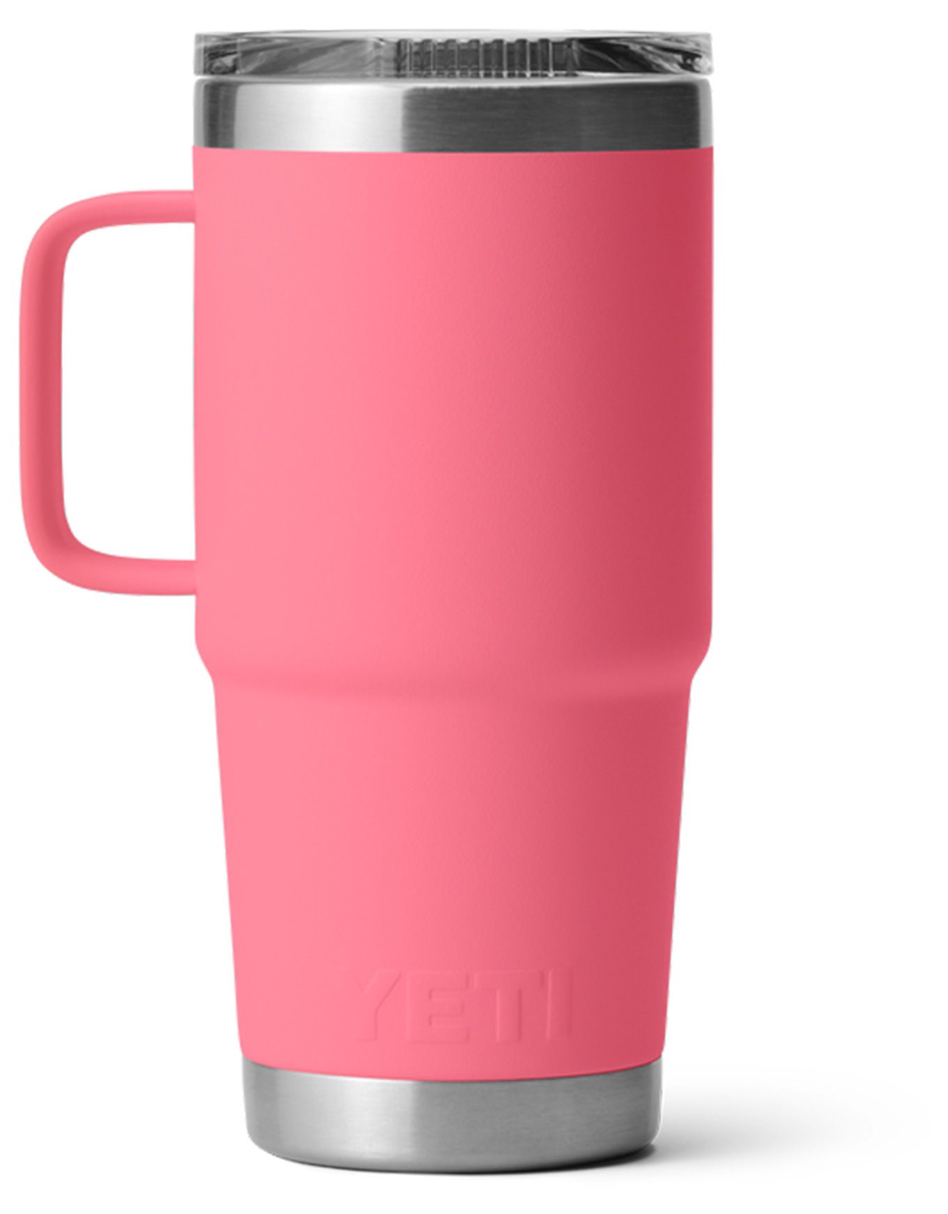 Yeti Rambler 20 Oz Travel Mug 2.0 Tropical Pink est une tasse de voyage isotherme en acier inoxydable avec couvercle Stronghold™ étanche, isolation double paroi, poignée surélevée et compatibilité lave-vaisselle.