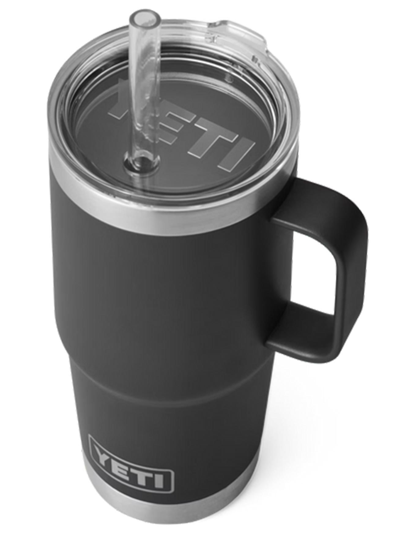 Tasse isotherme Yeti Rambler 25 Oz Straw Black en acier inoxydable 18/8, isolation double paroi, paille BPA incluse, poignée surélevée, compatible lave-vaisselle et porte-gobelets.