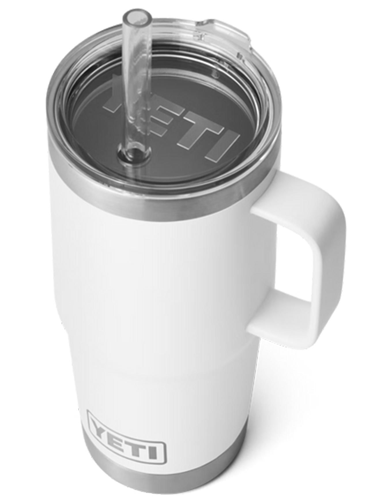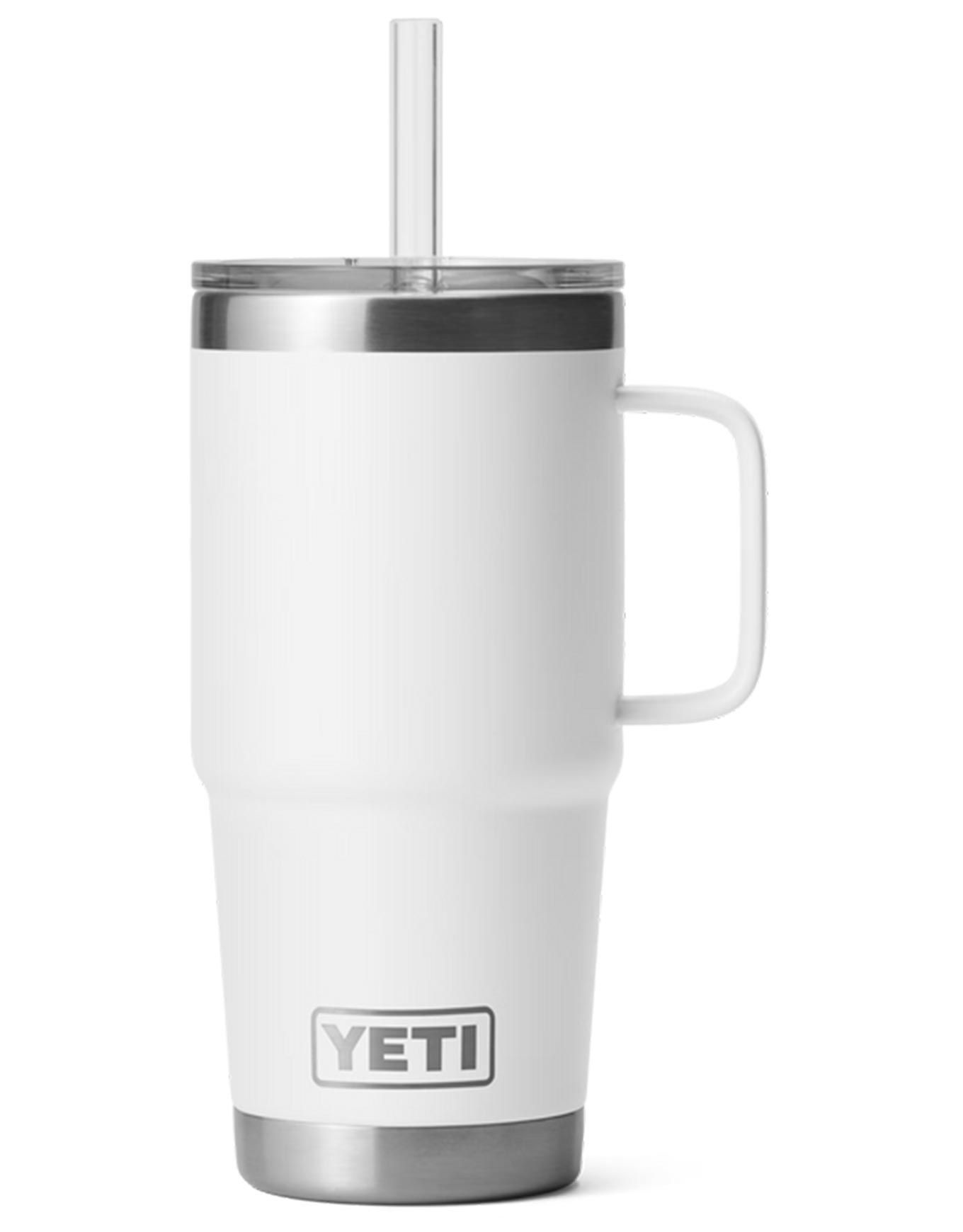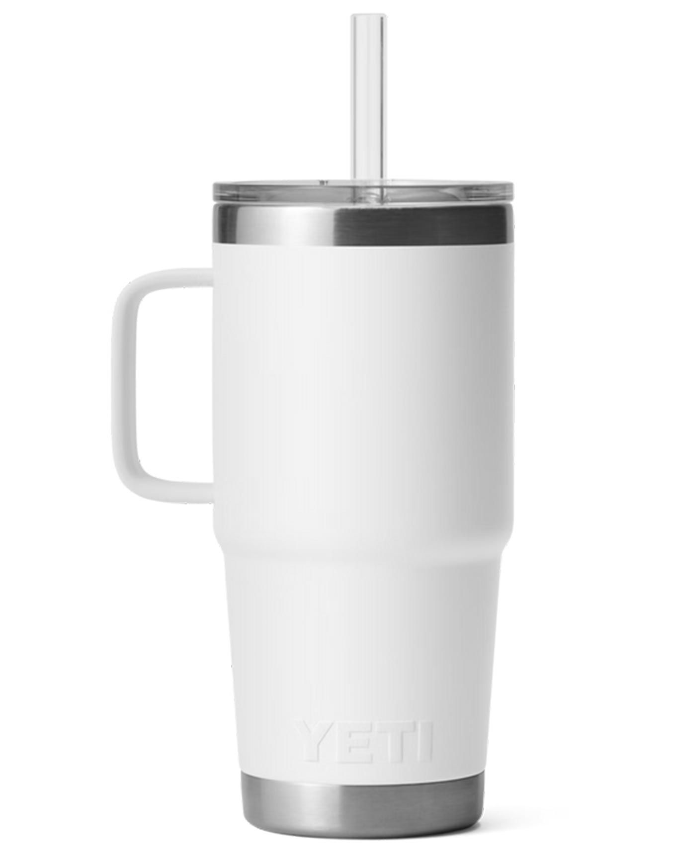 Tasse isotherme Yeti Rambler 25 Oz Straw White en acier inoxydable 18/8, isolation sous vide double paroi, couvercle paille BPA inclus, poignée surélevée, compatible lave-vaisselle et porte-gobelet.