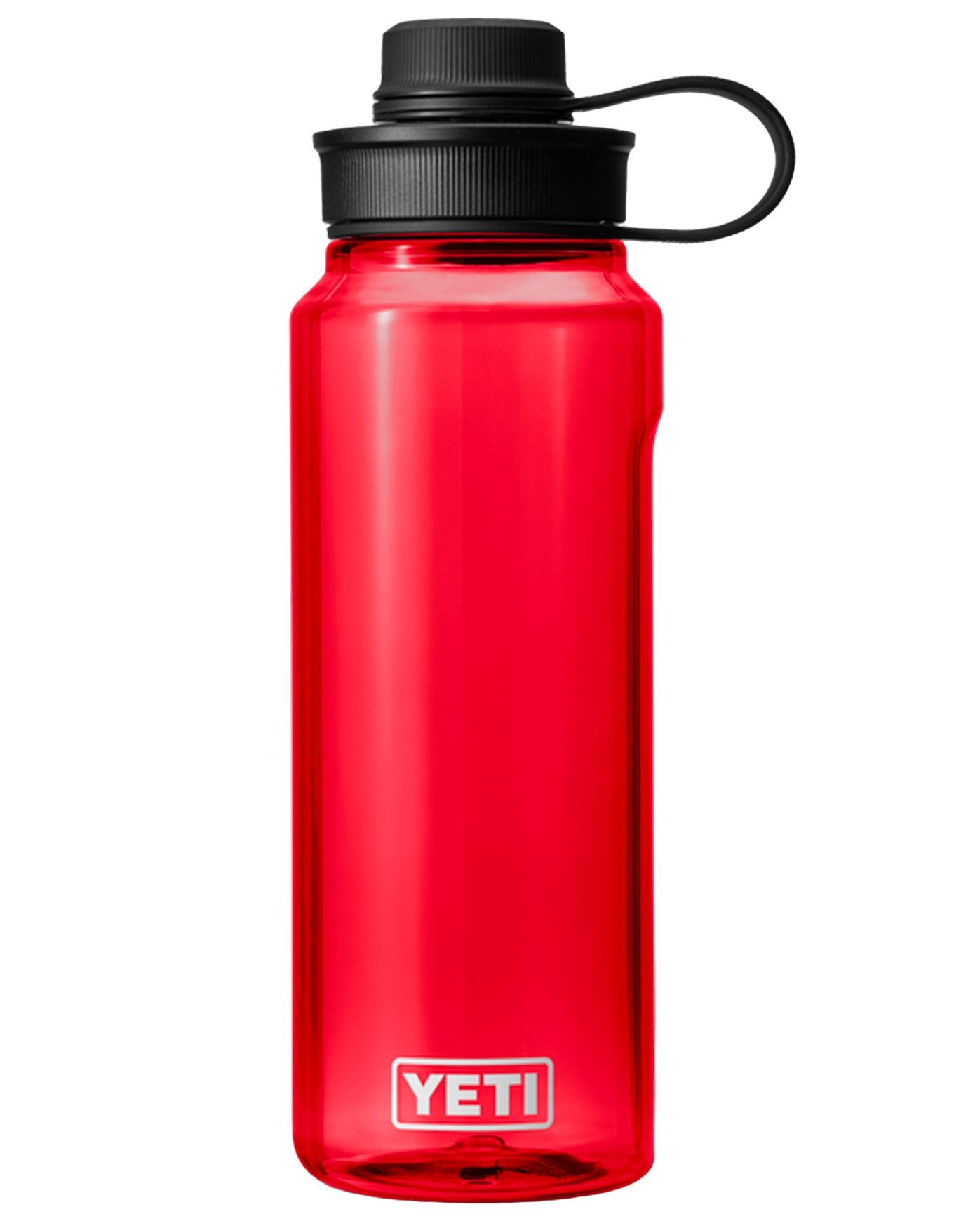 Bouteille d’hydratation Yeti Yonder Tether 1L Rescue Red en plastique recyclé, résistante aux chocs, avec bouchon Yonder™ étanche et sangle intégrée pour un transport pratique en randonnée ou sport.