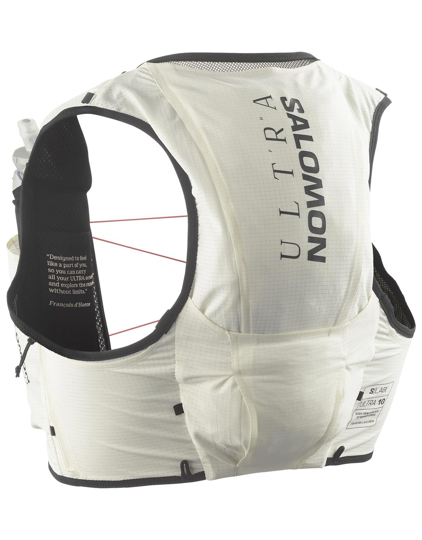 Le gilet d’hydratation Salomon S/lab Ultra 10 Set Vanilla Ice/Black offre un volume de 10 litres et un fit précis SensiFit™ pour les longues distances en trail, avec deux softflasks 500 ml et une matière stretch légère réduisant les frottements.
