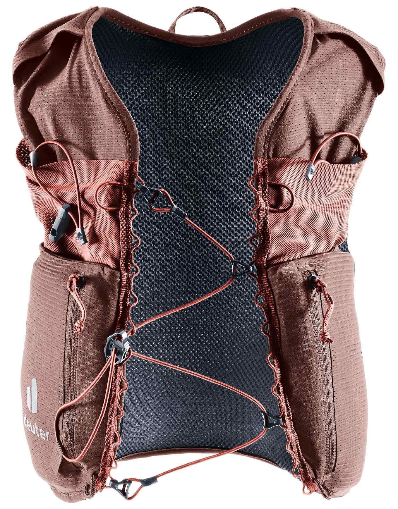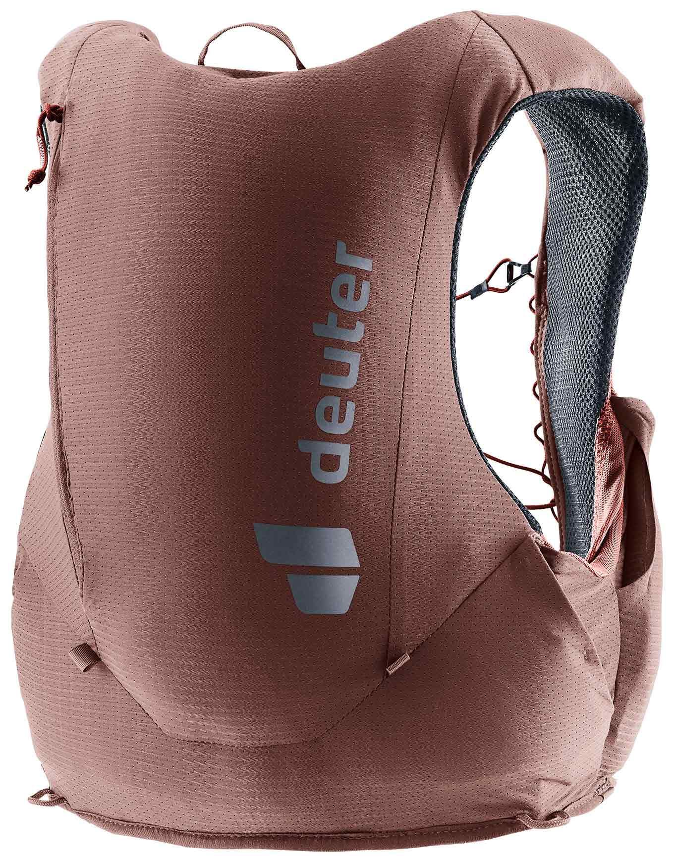 Gilet de trail running Deuter Traick 9 SL Raspia Caspia pour femme, léger et minimaliste, avec sangle poitrine élastique, compressions latérales, accès rapide aux poches et fixations bâtons avant/arrière. Stretch respirant, certifié Bluedesign® et neutre en CO₂.