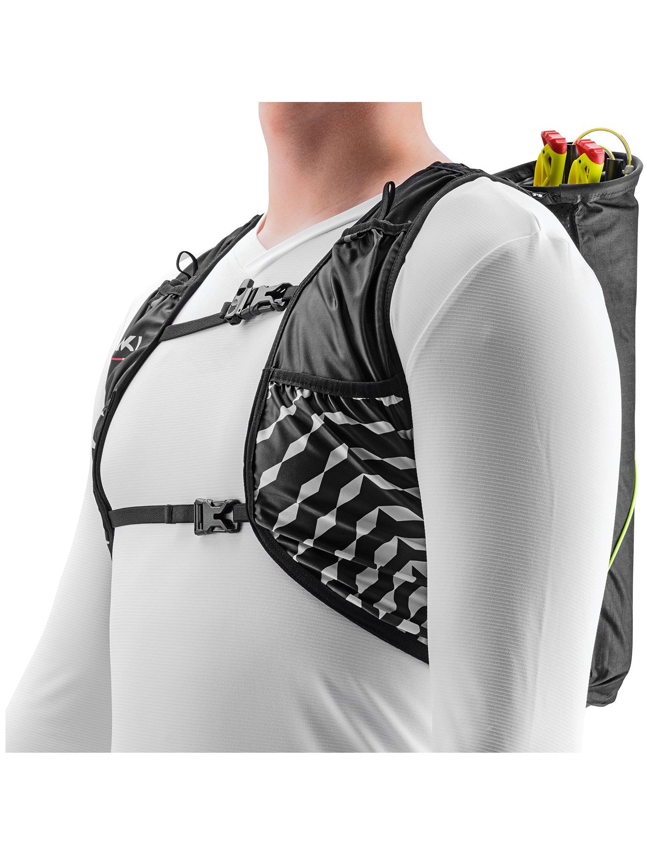 Conçue pour être utilisée avec le Trail Running Quiper de Leki, la veste de trail Quiver Vest offre une capacité de 6 litres. Des poches ergonomiques sont positionnées à l’avant comme à l’arrière, auxquelles s’ajoute une poche zippée. Deux soft flasks d’une contenance maximale de 500 ml, des gels et divers petits accessoires trouvent ainsi leur place sans gêner la course. Légère et respirante, cette veste s’adapte à toutes les morphologies. Le système intégré à la veste permet une fixation rapide et aisée du carquois Quiver. Ce dernier est utilisable avec les bâtons LEKI Superlite dont le diamètre est de 14 mm ou 16 mm.