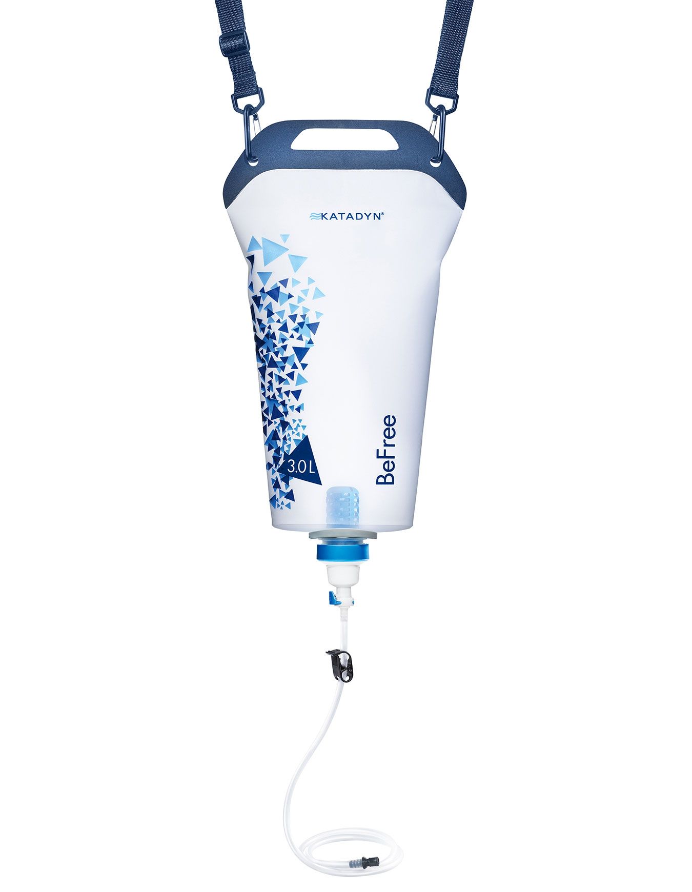 Katadyn BeFree Gravity 3L : système de filtration d’eau par gravité pour groupes. Membrane 0,1 micron élimine bactéries et protozoaires, débit 2 L/min, réservoir 3 L léger et compressible.
