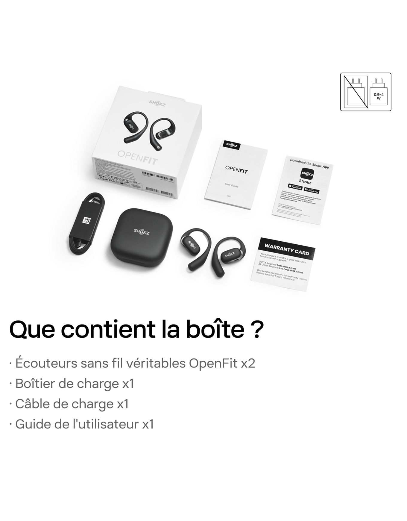 - Contenu : écouteurs OpenFit, étui de recharge, câble USB-C, manuel