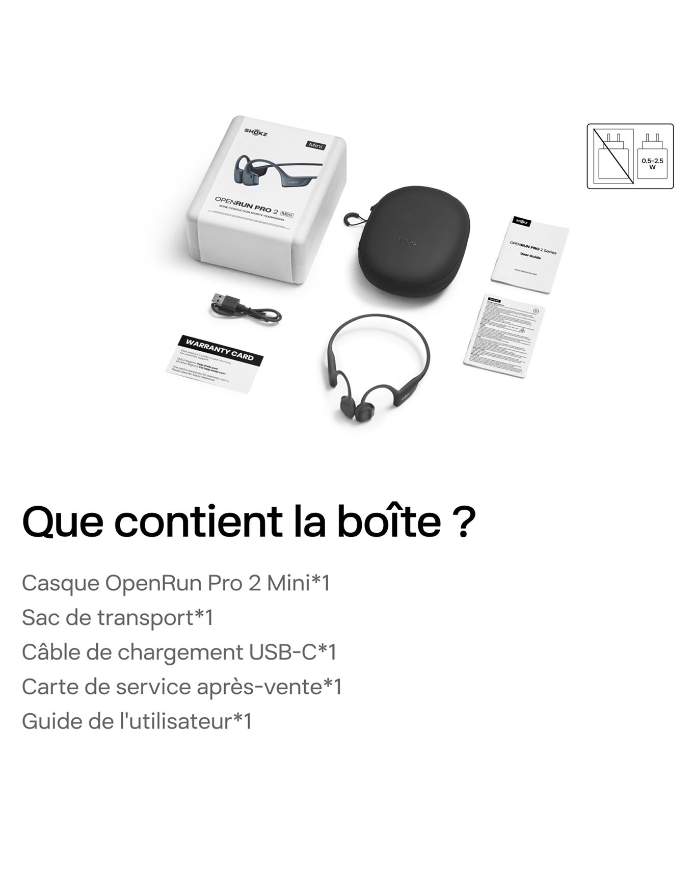 - Contenu de la boîte : écouteurs OpenRun Pro 2, cordon USB-C, étui rigide, carte garantie, guide utilisateur