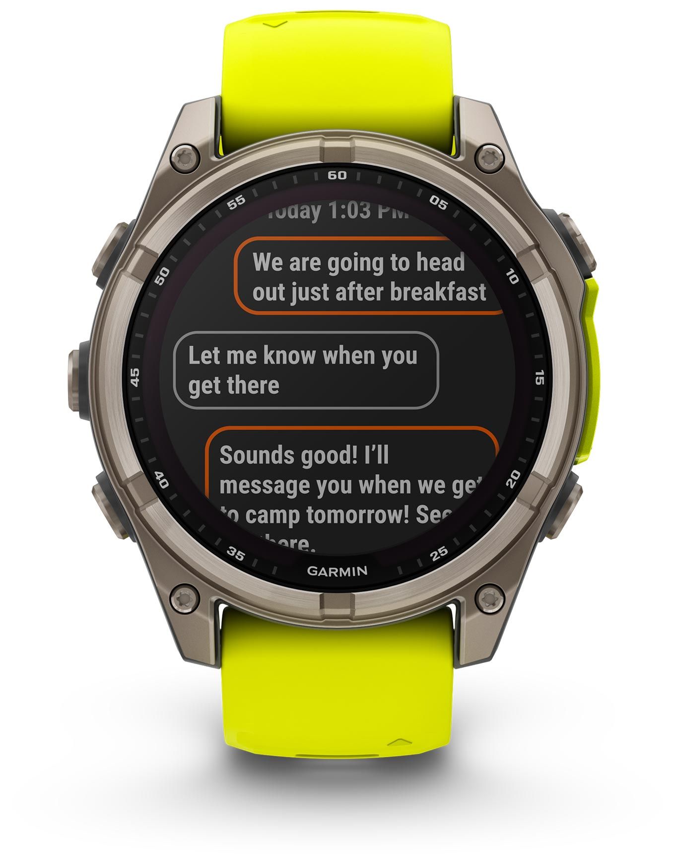 Équipée d’un haut-parleur et d’un micro, la montre autorise la réception et l’émission d’appels directement au poignet, sous réserve d’un couplage avec un smartphone compatible. L’envoi et la réception de messages texte sont également possibles sans manipulation du téléphone grâce à l’application Garmin Messenger.