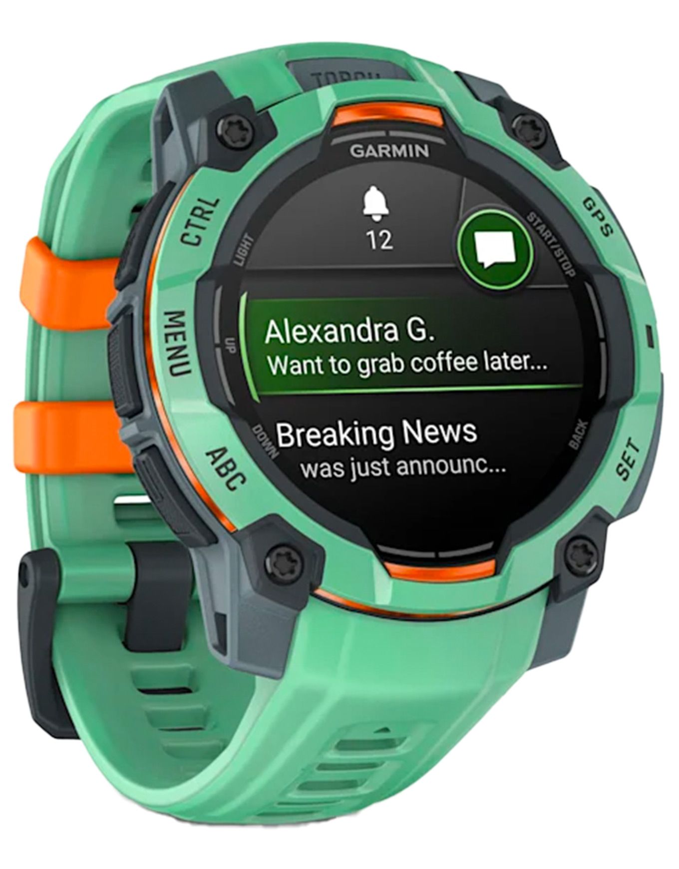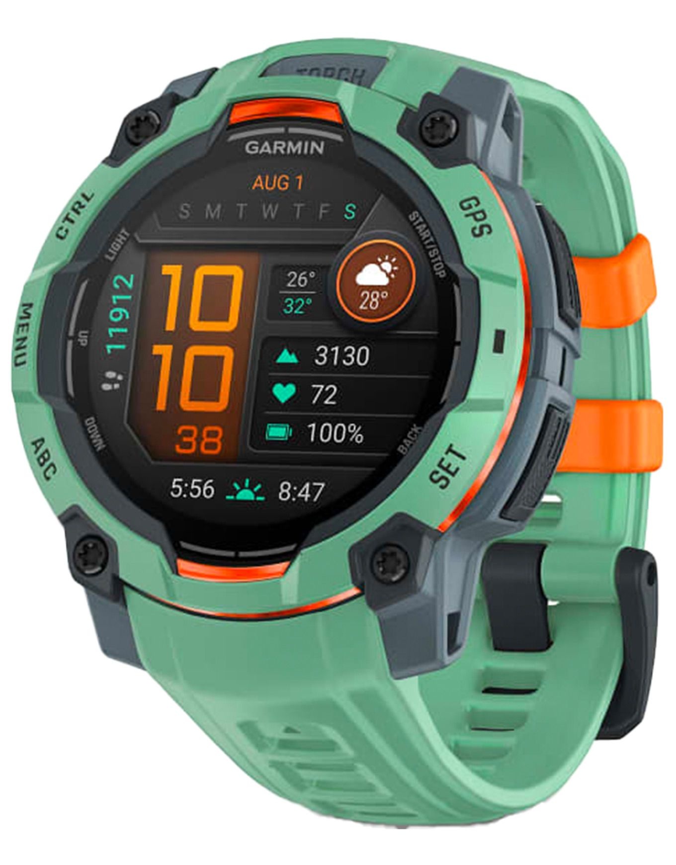 Montre GPS connectée Garmin Instinct 3 Amoled 45 mm Water Green, résistante aux chocs et rayures, étanche 10 ATM, autonomie 18 jours, GPS multi-bandes, suivi santé et sports.