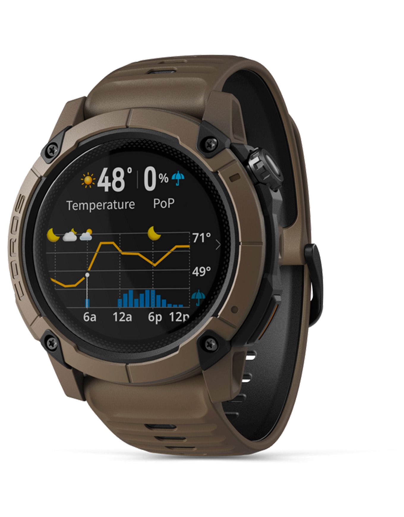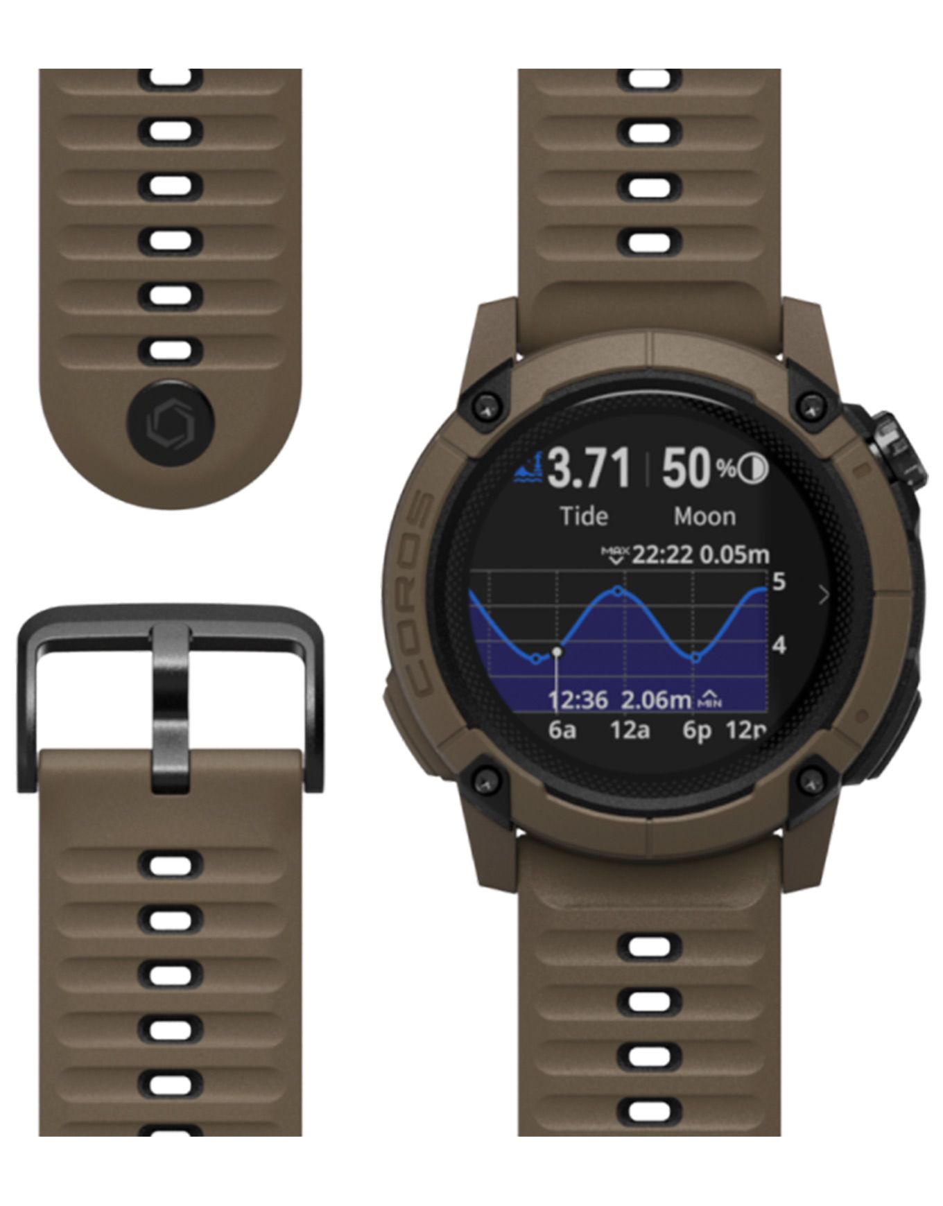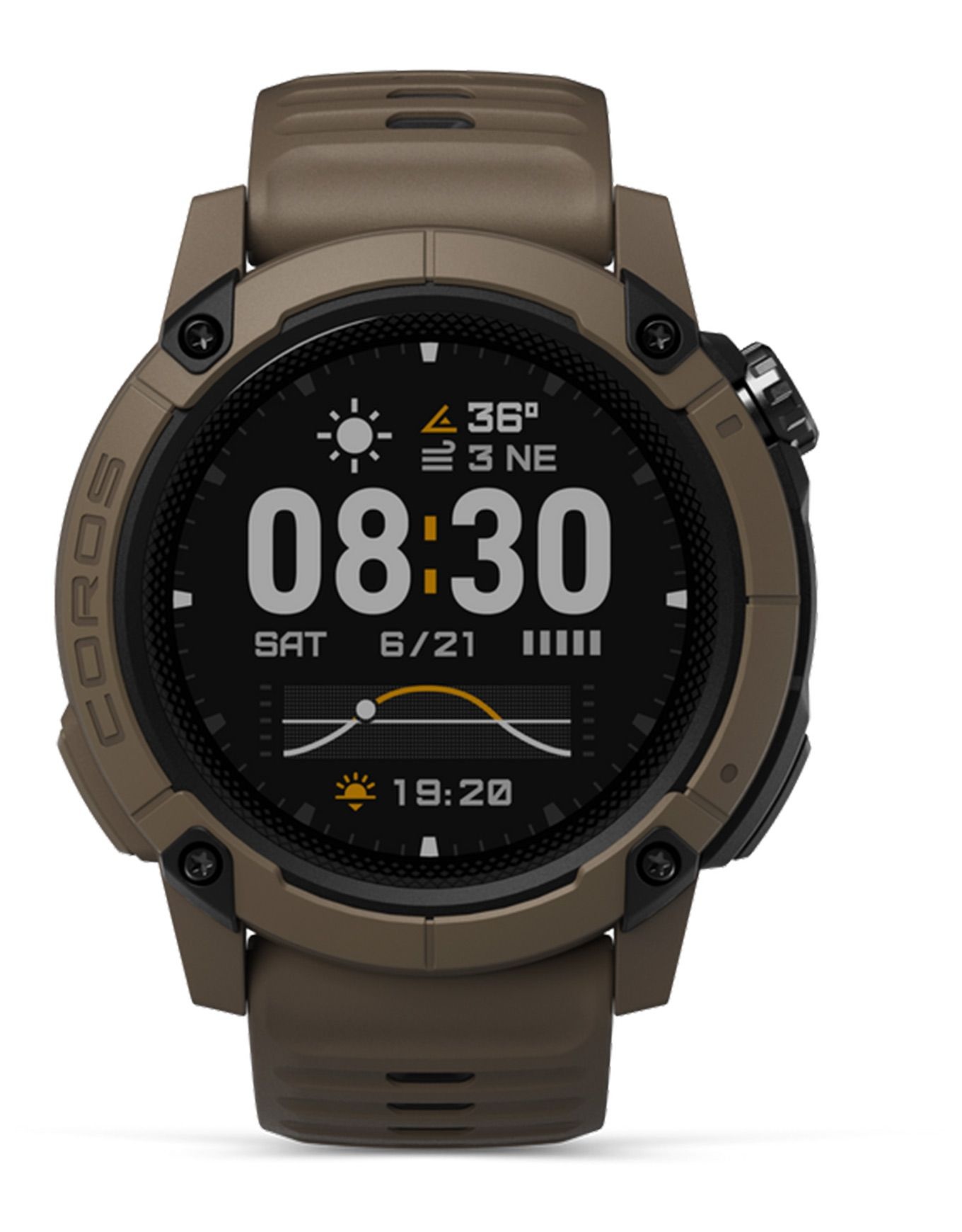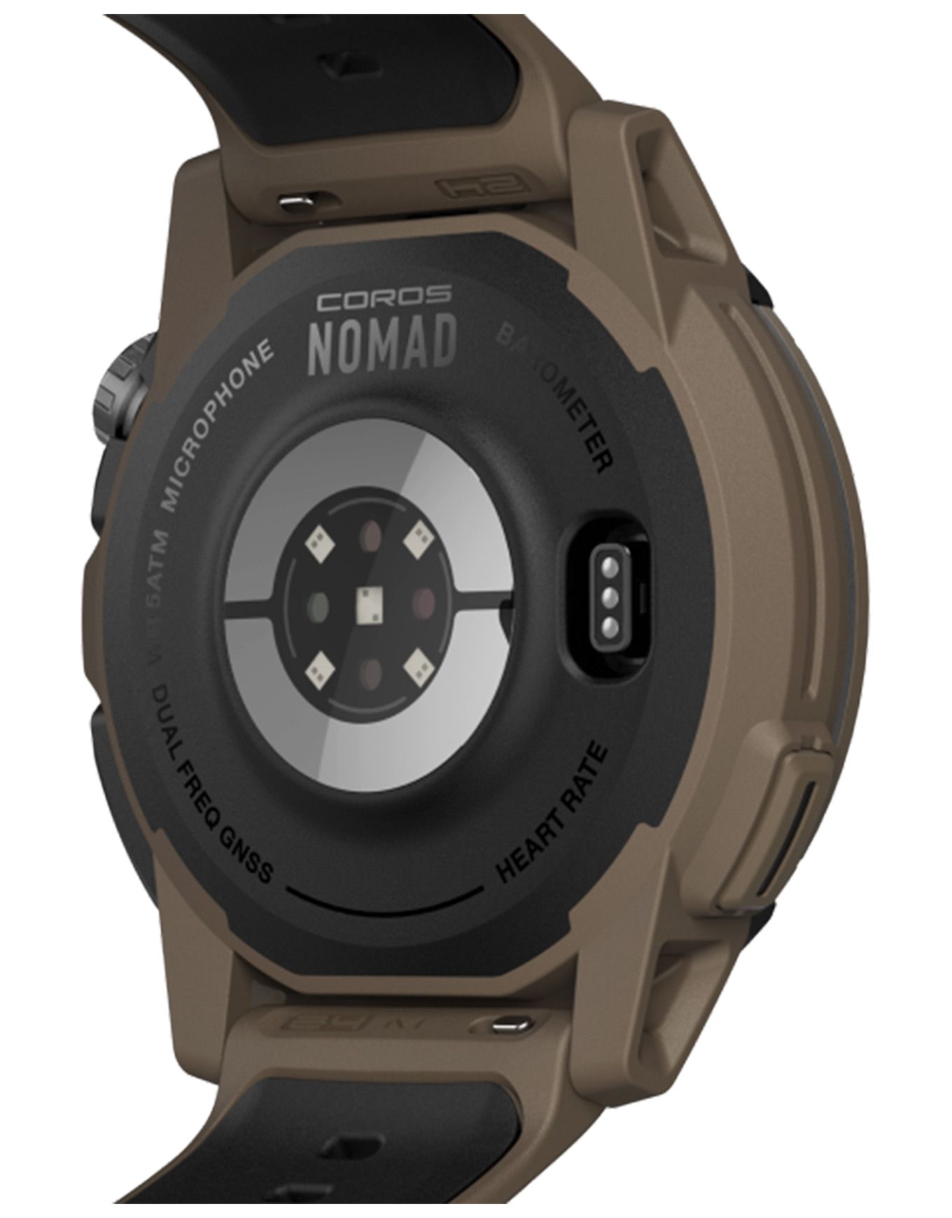 Montre GPS connectée Coros NOMAD Brown conçue pour l’aventure extrême : boîtier polymère-aluminium militaire, écran MIP visible en plein jour, autonomie 22 jours, navigation GPS double signal, capteurs outdoor et mode pêche avancé.