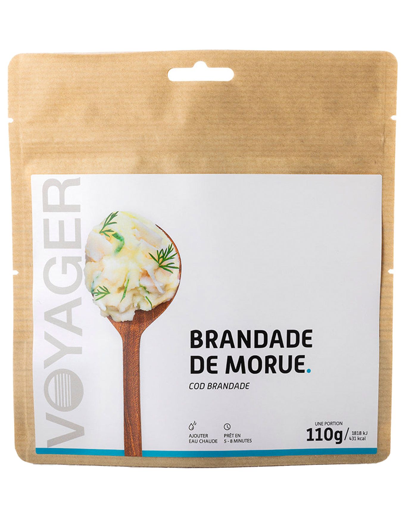 La brandade de morue Voyager se présente comme une purée veloutée combinant pommes de terre et filets de poisson, parfaite pour recharger vos batteries après une intense journée de rando. Préparation ultra-rapide : versez l’eau frémissante jusqu’au repère, remuez, laissez reposer quelques minutes et dégustez. De véritables éclats de morue apportent relief et saveur à ce velouté qui ravira les explorateurs en quête d’un repas chaleureux sans prise de tête. Cette brandade lyophilisée se savoure partout, en un clin d’œil. Découvrir les catégories associées Repas lyophilisés Matériel trekking et camping Alimentation/hydratation