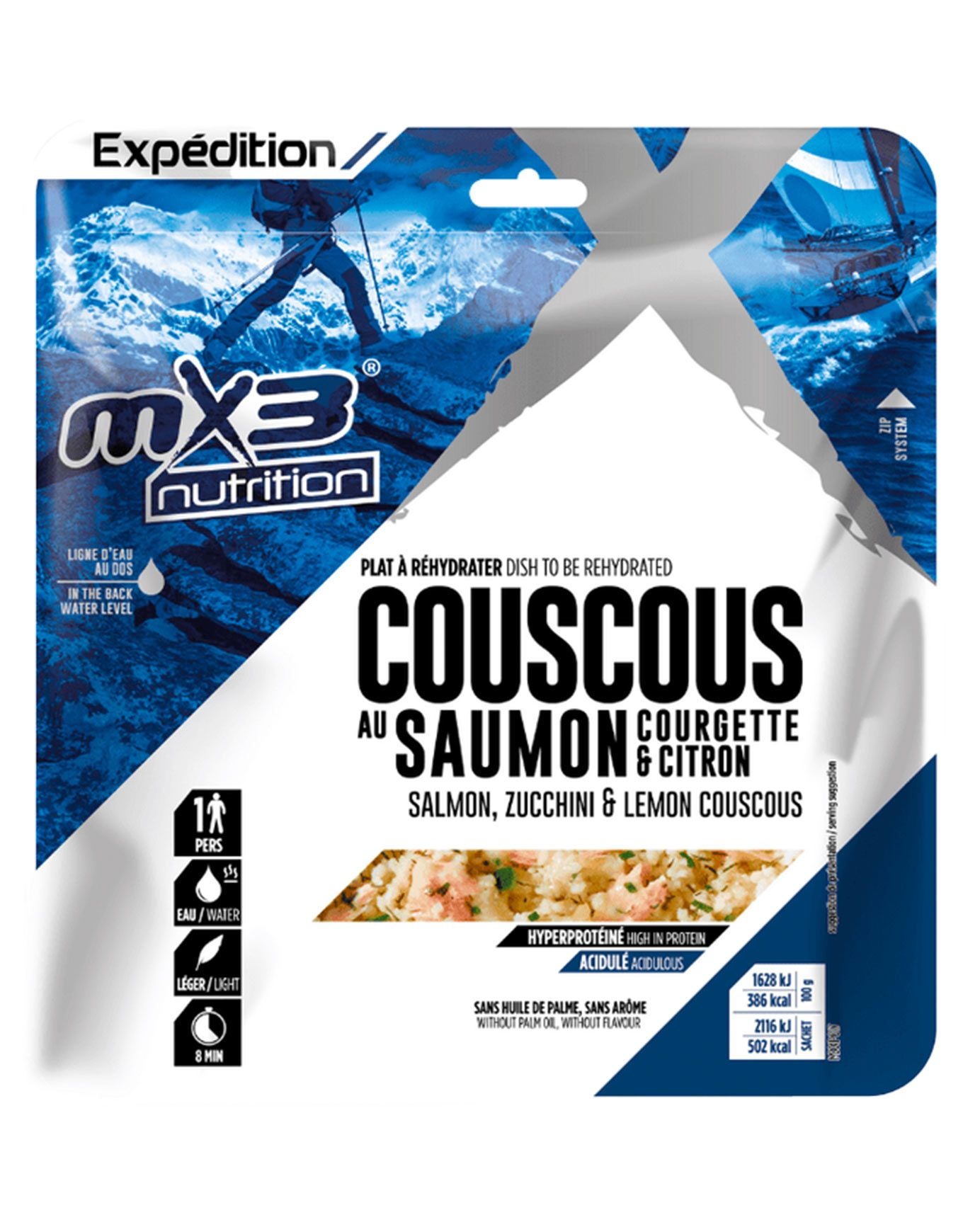 Signé MX3, ce plat lyophilisé pescétarien marie avec brio les saveurs marines du saumon, la douceur fondante des courgettes et l’acidité raffinée du citron. Le Couscous saumon-courgette au citron se distingue par sa richesse en protéines et sa texture onctueuse qui se révèle en à peine 8 minutes par simple ajout d’eau chaude. Une solution express et savoureuse pour vos pauses en pleine nature, alliant légèreté et équilibre nutritionnel au creux de vos escapades les plus sauvages. À glisser sans hésiter dans le sac à dos pour une touche de fraîcheur revitalisante. Découvrir les catégories associées Repas lyophilisés Matériel trekking et camping Alimentation/hydratation