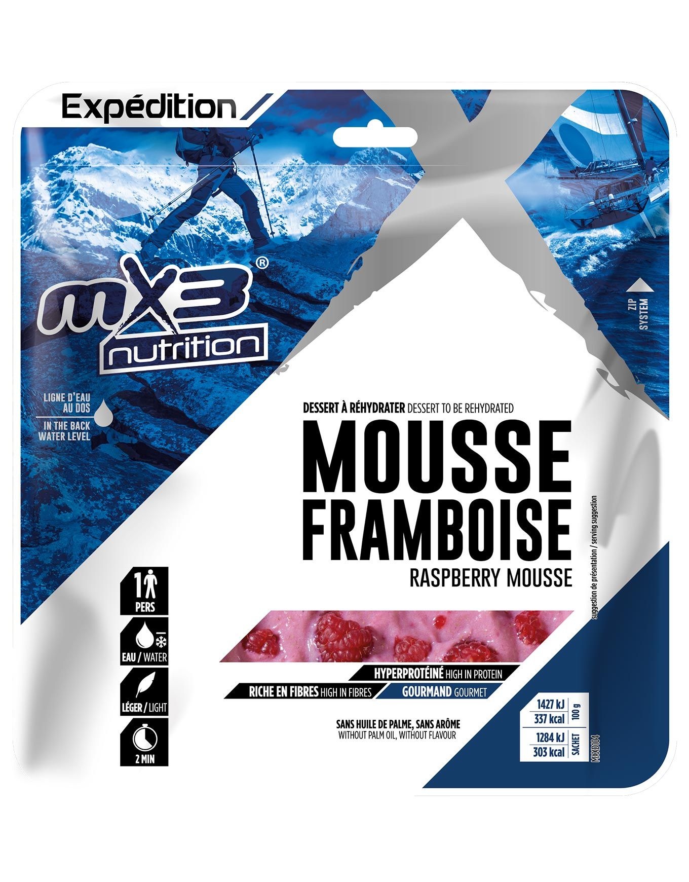 La Mousse Framboise MX3 Nutrition® allie plaisir et équilibre : une texture légère enrichie en protéines et en fibres, parsemée de véritables éclats de framboise pour une note acidulée à chaque bouchée. Découvrir les catégories associées Repas lyophilisés Matériel trekking et camping Alimentation/hydratation