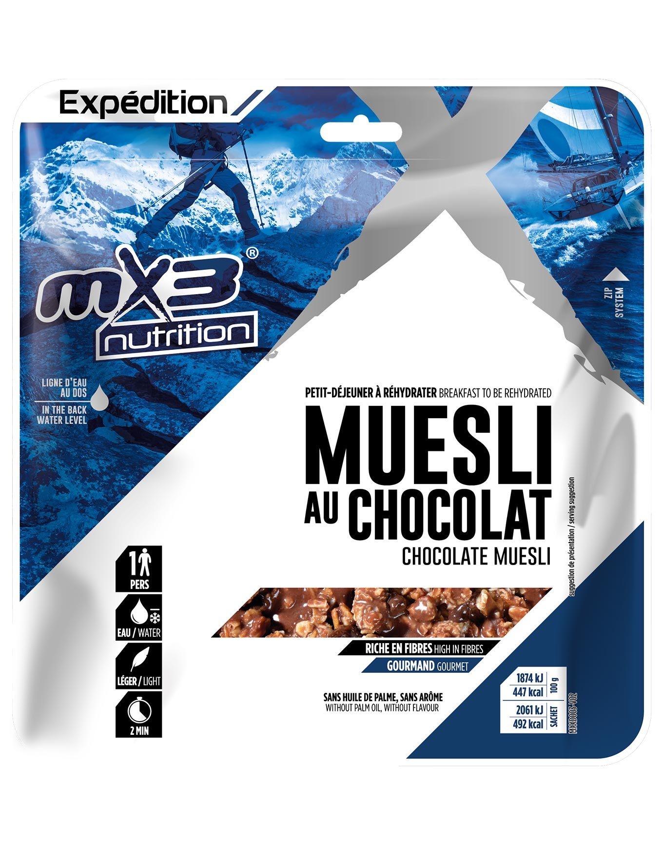 Lancez la journée avec ce savoureux Muesli au Chocolat signé MX3 Nutrition®, un boost énergétique idéal avant une longue et intense activité. Son emballage est pensé pour vous permettre de déguster le contenu sans autre récipient. Compact, il se glisse facilement dans le sac, se prépare en un clin d’œil, se réalise en un temps record et se savoure avec plaisir. L’alliance croustillante des céréales et la gourmandise du chocolat fournissent les calories nécessaires à vos performances. Découvrir les catégories associées Repas lyophilisés Matériel trekking et camping Alimentation/hydratation