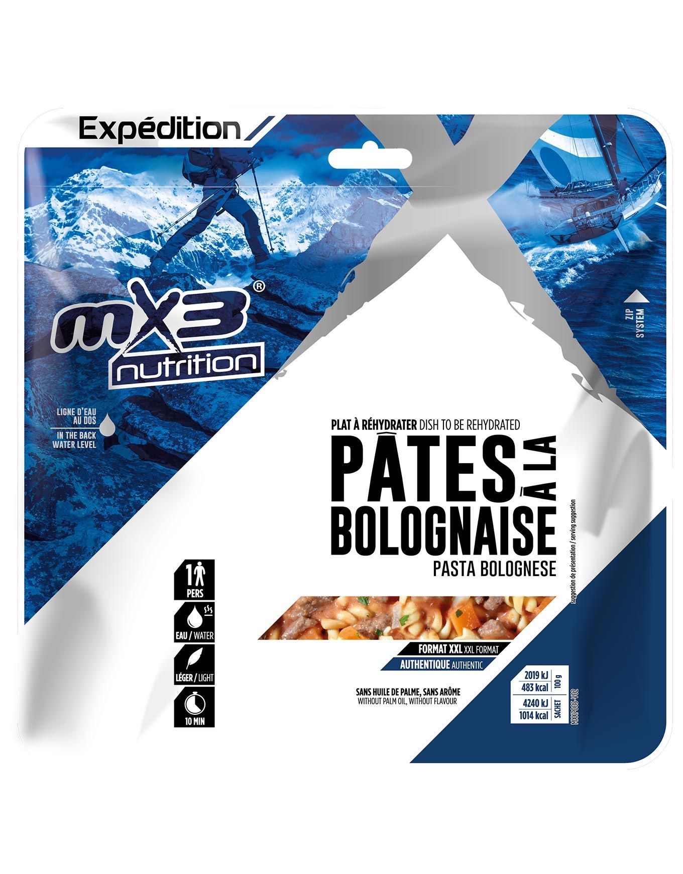 Les Pâtes bolognaise MX3 Nutrition® constituent le must-have des gourmets de plats déshydratés. Grâce à ses spirales fines élaborées à base de blé tricolore, cette préparation à l’accent transalpin offre un véritable carburant durant vos escapades nature. Ultra-compact, ce mets riche en calories, pensé pour les dépenses énergétiques intenses, reprend vie en 10 min avec un peu d’eau chaude. Le conditionnement minimaliste et plume se glisse sans effort dans le compartiment d’un sac de rando. Découvrir les catégories associées Repas lyophilisés Matériel trekking et camping Alimentation/hydratation