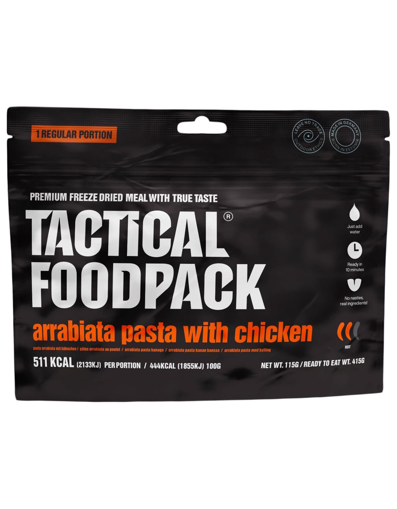 Ce paquet de 115 g de Pâtes arrabiata au poulet signé Tactical Foodpack est un plat déshydraté conçu pour vous fournir l’énergie et les nutriments indispensables lors de longues randonnées ou en contexte de survie. Grâce à la lyophilisation, les arômes, les textures et les propriétés nutritives restent intacts. Préparez ce met savoureux en quelques minutes et retrouvez vos forces pour reprendre la route. Ce repas salé combine des pâtes de blé dur et des morceaux de poulet tendres, nappés d’une sauce tomate relevée au piment, à l’ail et à un bouquet d’herbes italiennes. Légers et compacts, ces sachets se faufilent sans peine dans le sac et optimisent l’espace disponible. Découvrir les catégories associées Repas lyophilisés Matériel trekking et camping Alimentation/hydratation