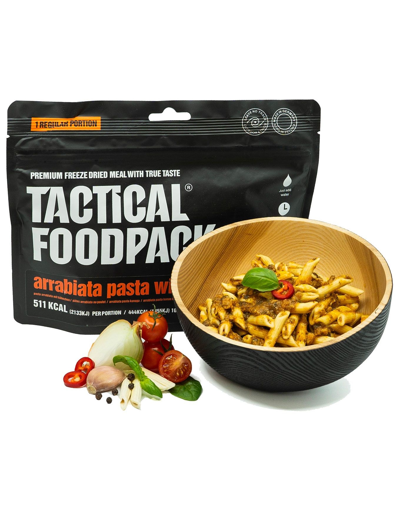 L’arrabiata au poulet de Tactical Foodpack se présente sous forme de plat lyophilisé conditionné en sachet de 115 g, spécialement élaboré pour l’apport énergétique et nutritionnel indispensable lors d’expéditions prolongées ou de situations de survie. Grâce à la technique de lyophilisation, arômes, saveurs et valeurs nutritionnelles demeurent parfaitement préservés. Ce plat gourmand se réhydrate en quelques minutes seulement, vous permettant de récupérer efficacement avant de reprendre votre itinéraire. La recette associe des pâtes de blé dur à des morceaux de poulet tendres, le tout enrobé d’une sauce tomate épicée au piment, parfumée à l’ail et aux herbes méditerranéennes. La compacité et la légèreté de ces emballages facilitent leur rangement dans le sac à dos, optimisant ainsi l’encombrement disponible. Découvrir les catégories associées Repas lyophilisés Matériel trekking et camping Alimentation/hydratation