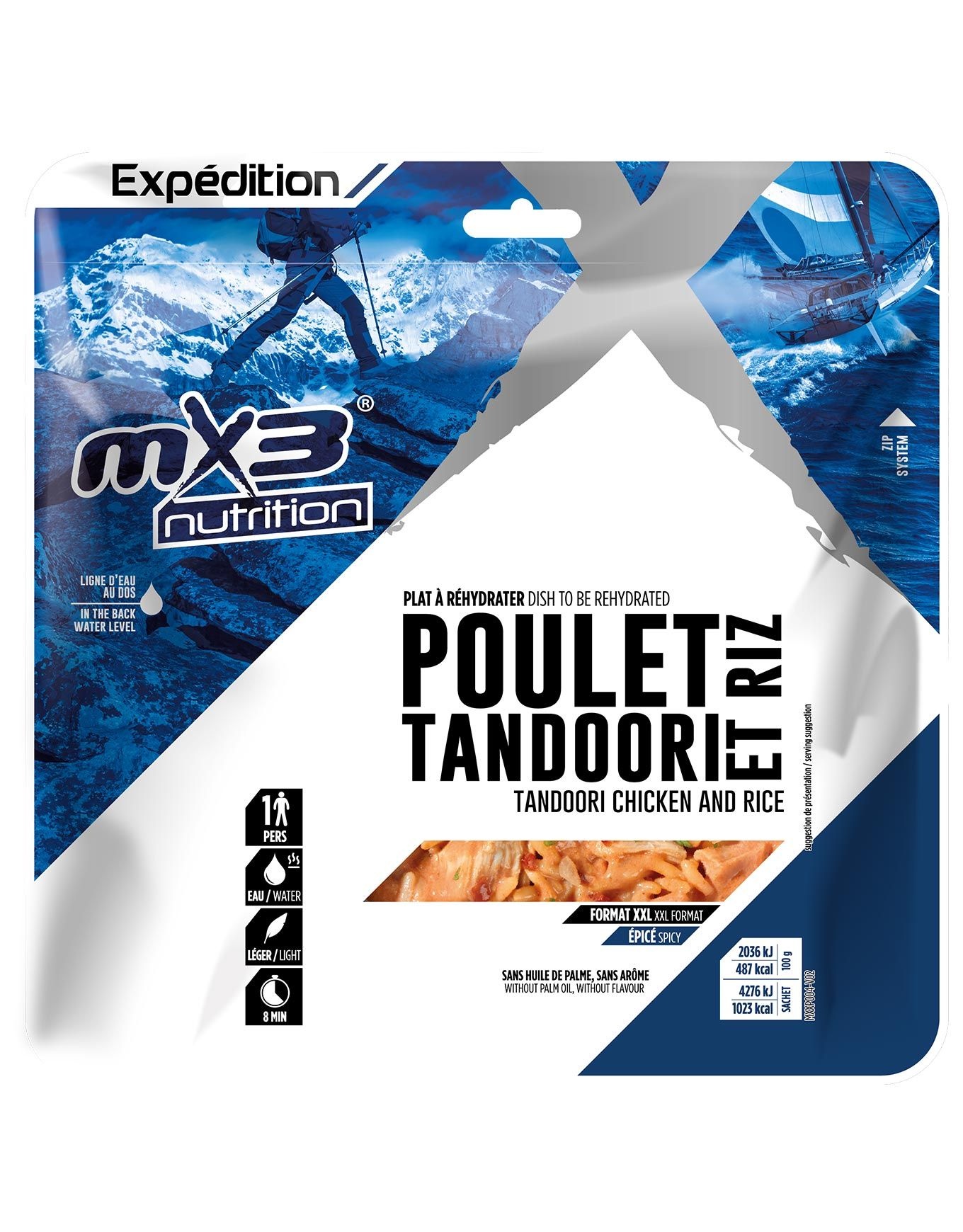 Le Poulet Tandoori & Riz de MX3 Nutrition® est une création culinaire s’inspirant d’une spécialité indienne incontournable, où la subtilité du lait de coco vient adoucir un mélange d’épices aromatiques (paprika et curry), le tout accompagné de riz. Avec sa densité calorique élevée, cette préparation satisfait les besoins énergétiques les plus importants et retrouve sa consistance en l’espace de 10 minutes seulement après ajout d’eau chaude. Son conditionnement compact et peu encombrant trouve aisément sa place au fond d’un sac à dos de randonnée. Explorer les rubriques connexes Repas lyophilisés Équipement trek et bivouac Nutrition et hydratation