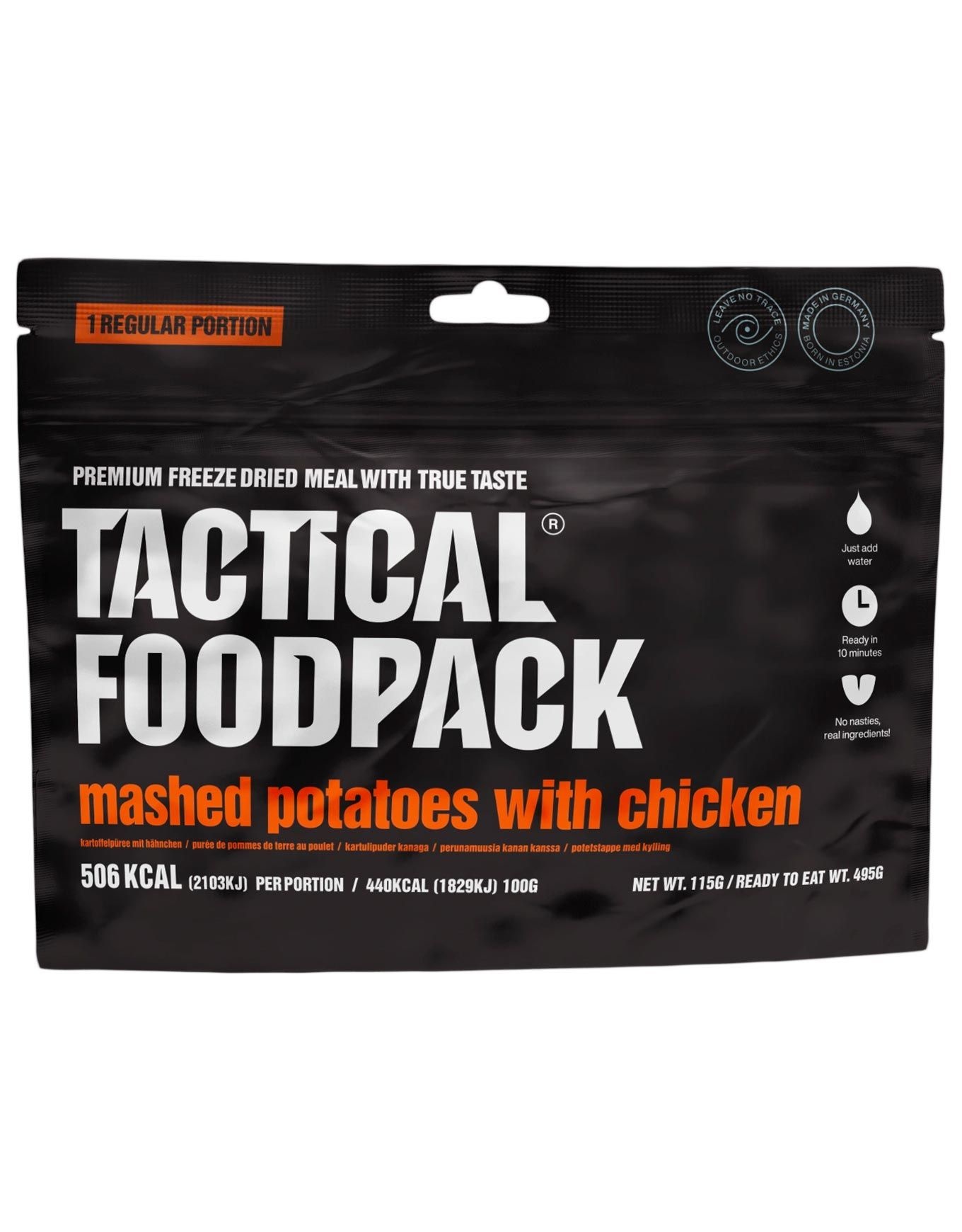 Conçue pour accompagner vos expéditions prolongées ou vos situations de survie, cette préparation lyophilisée Purée pommes de terre et poulet de la marque Tactical Foodpack se présente sous un format de 115 g. Grâce à la lyophilisation, arômes, saveurs et qualités nutritionnelles demeurent préservés. En quelques minutes seulement, un plat réconfortant est prêt à consommer, vous permettant de récupérer l’énergie nécessaire à la poursuite de votre itinéraire. Cette recette salée mélange pommes de terre, émincés de poulet et oignons. Par leur légèreté et leur compacité, ces emballages s’intègrent aisément dans votre sac à dos tout en minimisant l’espace occupé. Explorer les catégories liées Repas lyophilisés Matériel trekking et camping Alimentation/hydratation