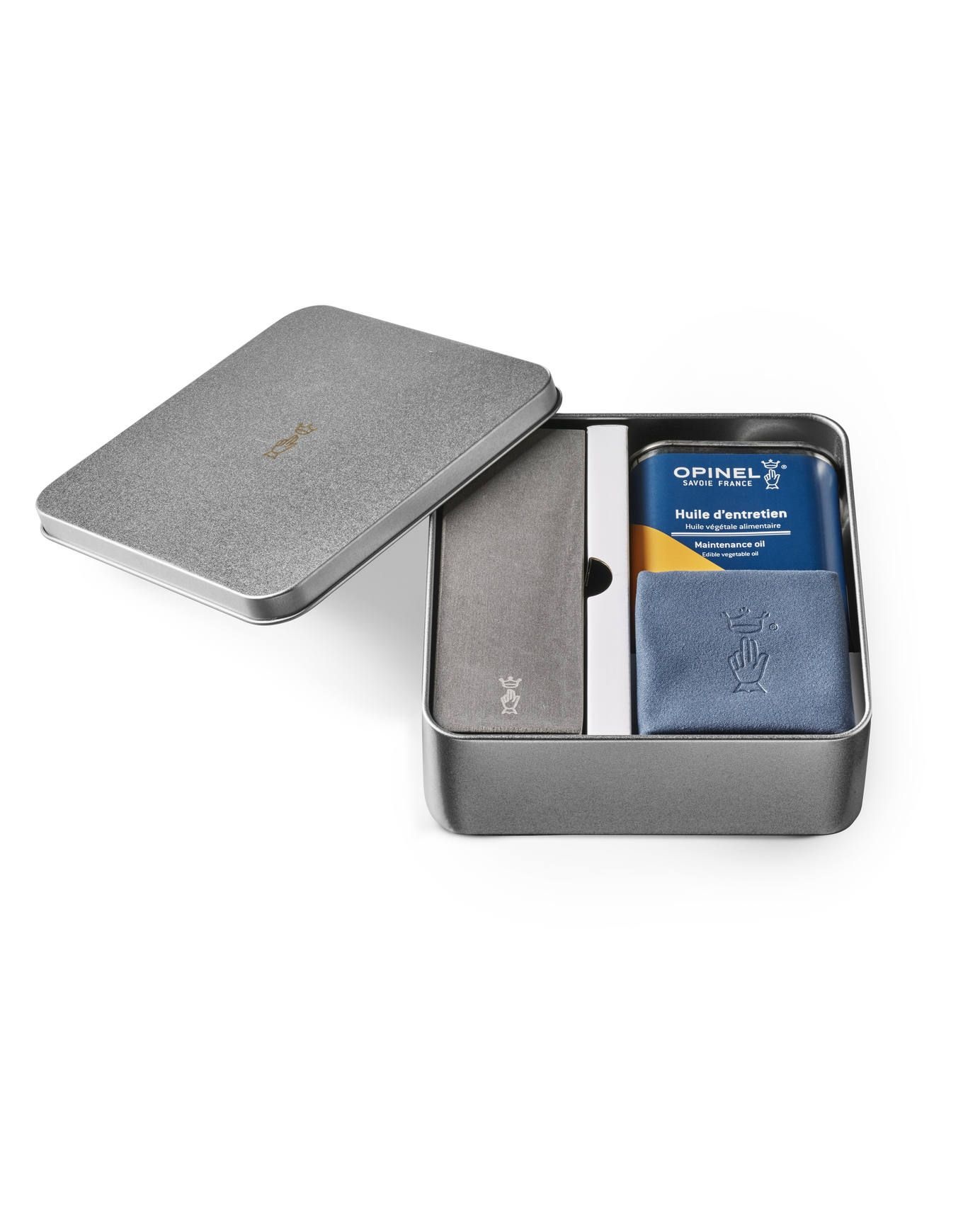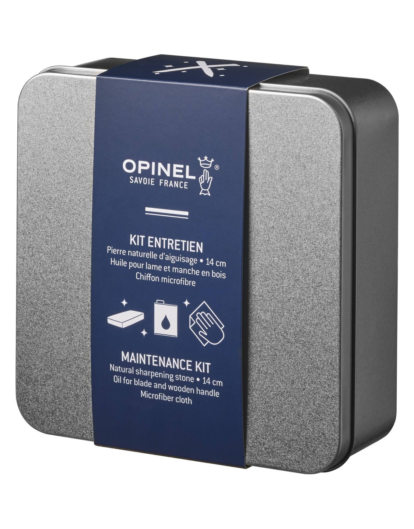Kit d’entretien Opinel : boîte métallique contenant une pierre des Pyrénées pour aiguiser, un bidon d’huile pour nourrir les lames et un chiffon microfibre 20×20 cm.