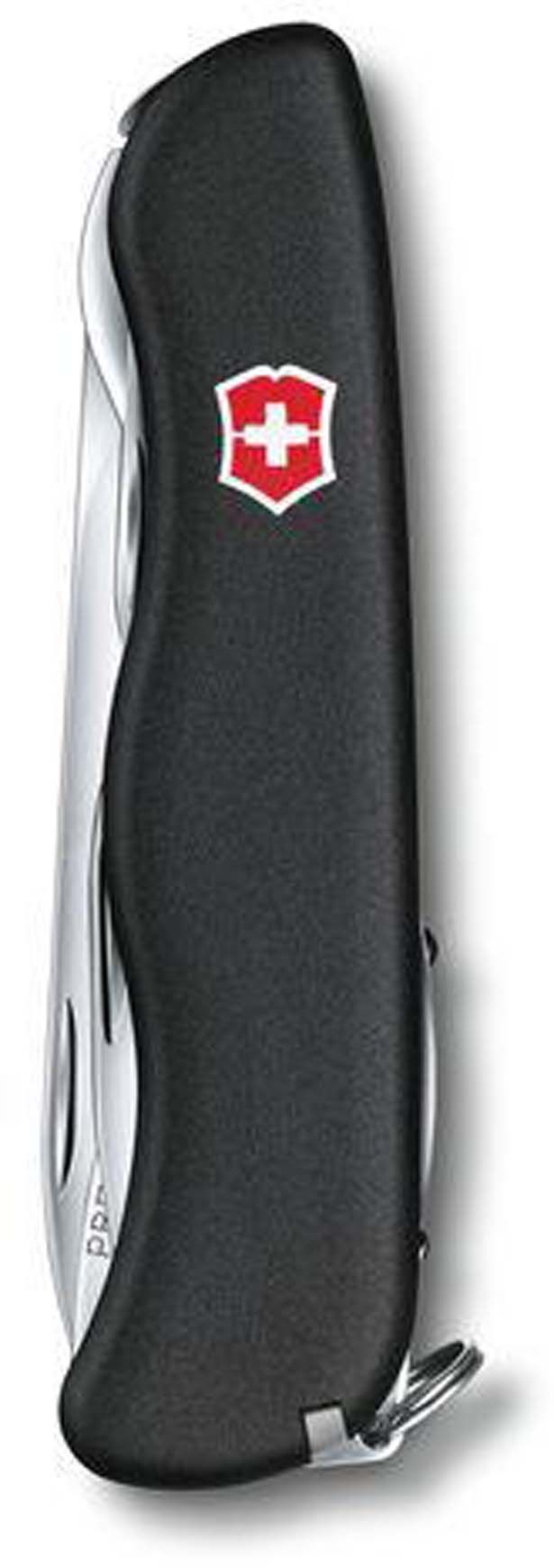 Corps compact équipé d’une grande lame à blocage, d’un décapsuleur à blocage, d’un dénudeur de fils électriques, de tournevis 7,5 mm et 3 mm, d’un ouvre-boîtes, d’un poinçon alésoir, d’un tire-bouchon, de pincettes, d’un cure-dents et d’un anneau d’accroche.