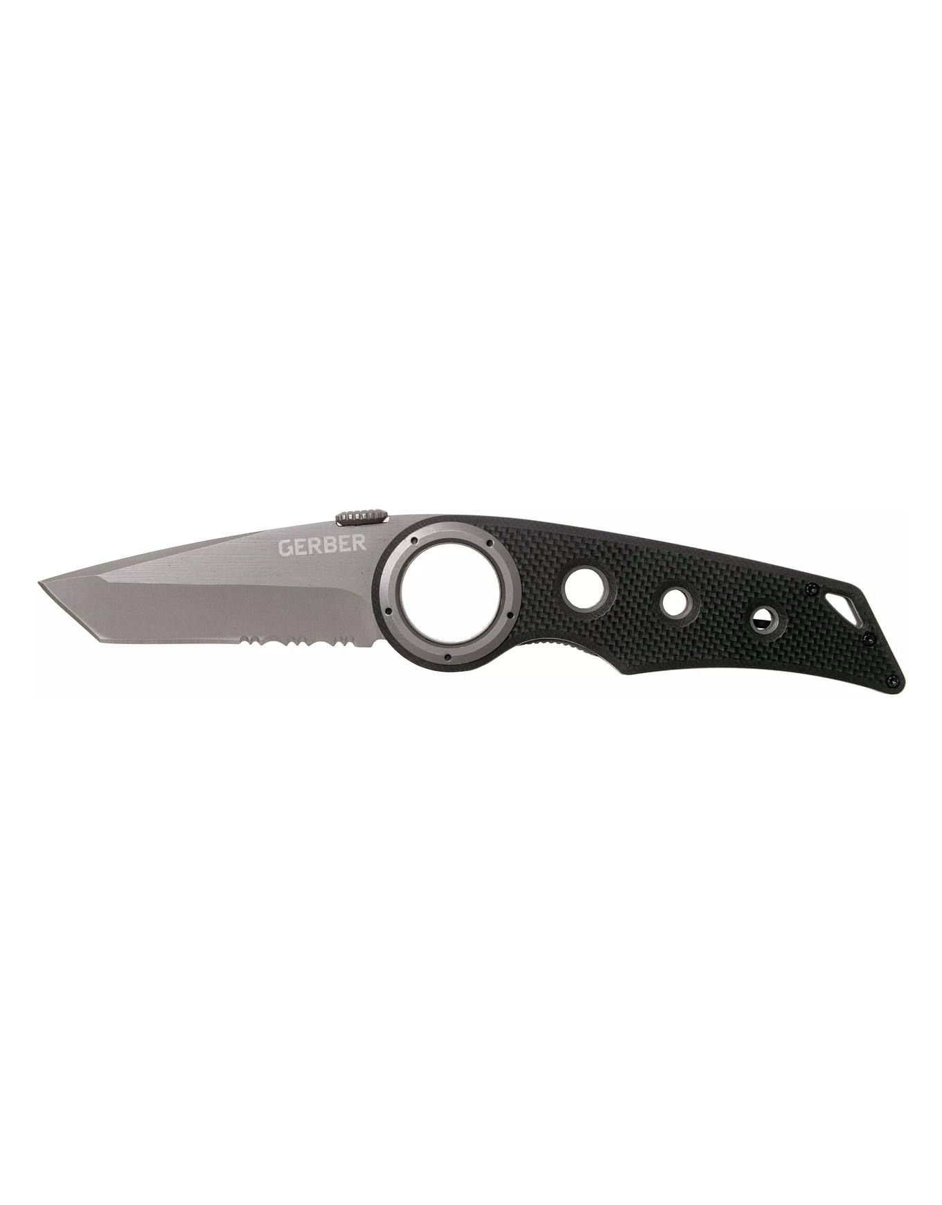 Couteau pliant Gerber Remix, lame acier inoxydable Tanto semi-lisse semi-dentelée, format compact pour poche ou ceinture, avec mousqueton intégré.