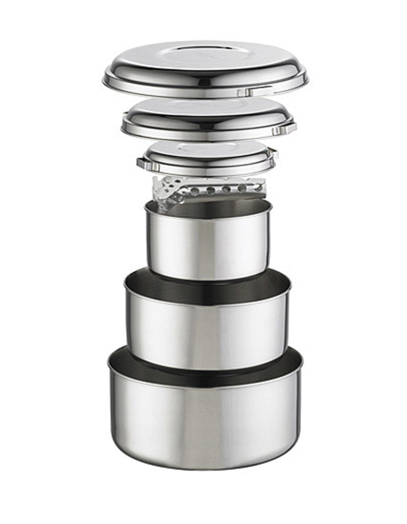 L’ensemble de casseroles MSR Alpine 4 Pot Set, en acier inoxydable, offre robustesse et compacité pour les cuisiniers itinérants. Les quatre casseroles s’imbriquent avec tasses ou assiettes DeepDish et le couvercle fait office d’assiette.