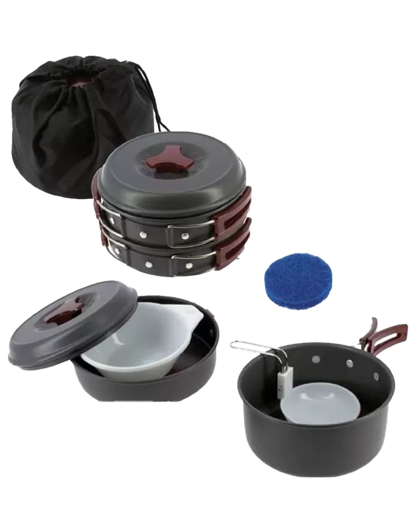 - Fourni avec : casserole 15 x 8,2 cm, poêle 15,4 x 3,7 cm, cuillère soupe, cuillère riz, 2 bols, éponge