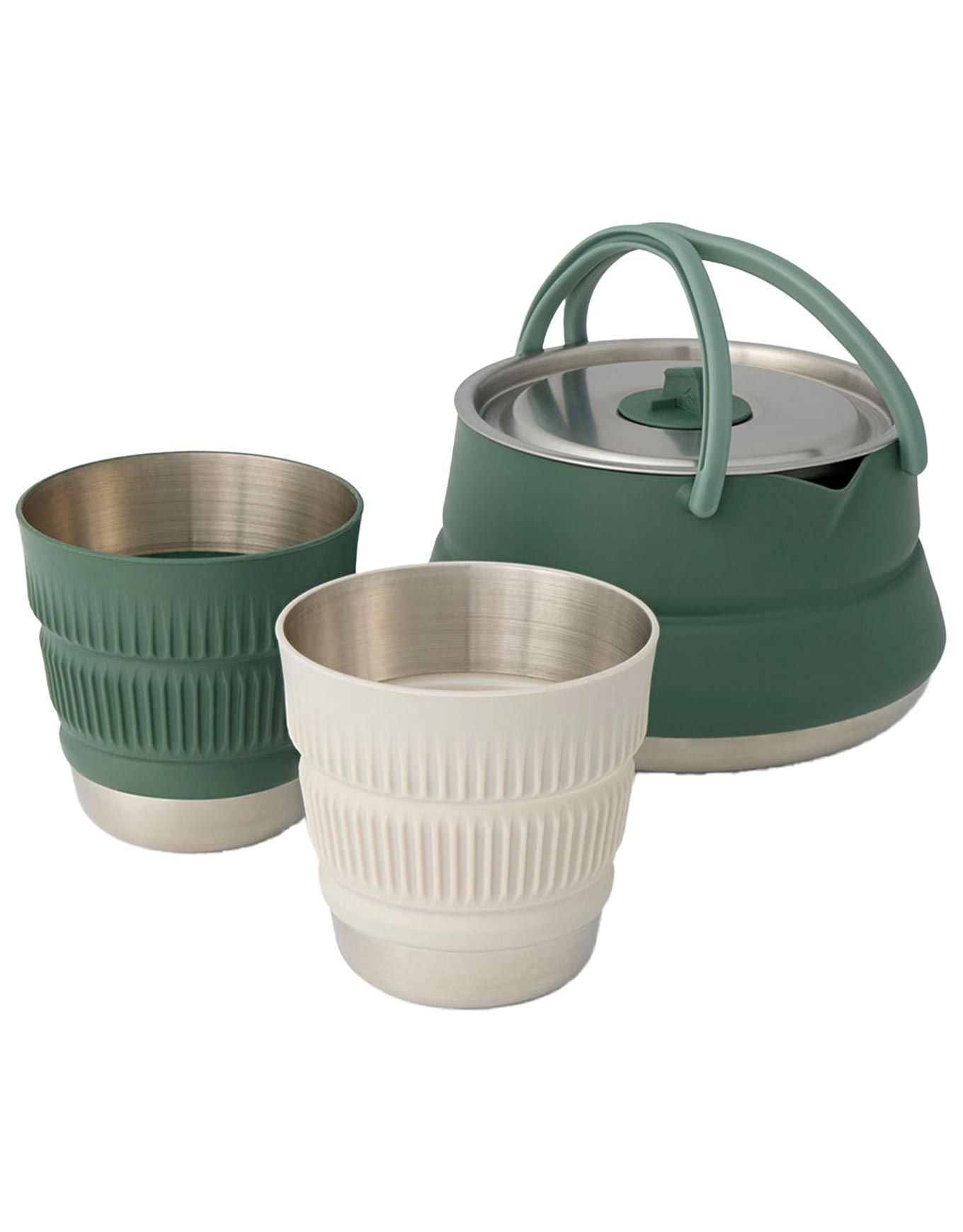 Le Detour Stainless Steel Kettle Cook Set Sea To Summit est un service à thé pliable en acier inoxydable pour le camping, composé d’une bouilloire compatible induction/gaz et de deux tasses emboîtables, avec poignées et bord silicone pour un versement sûr.