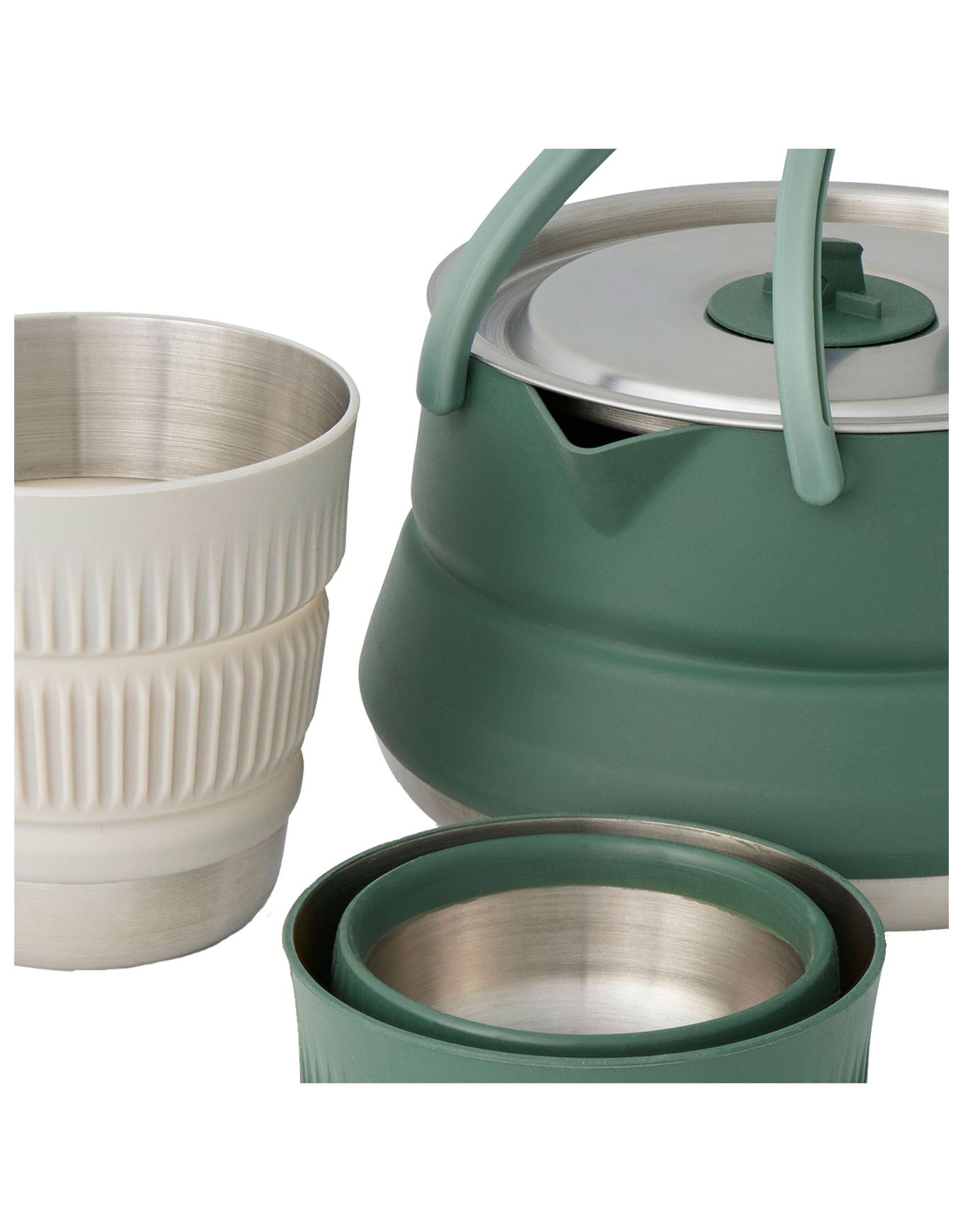 Il se compose de 2 tasses et d’une bouilloire doté d’un bord généreux en silicone et de deux poignées garantissant un service en toute sécurité. L’emploi sur feux gaz, induction et réchauds est rendu possible par une base confectionnée en acier inoxydable. Un emboîtement des différents éléments assure une compacité optimale. La composition en acier inoxydable et silicone confère une excellente robustesse à l’ensemble.
